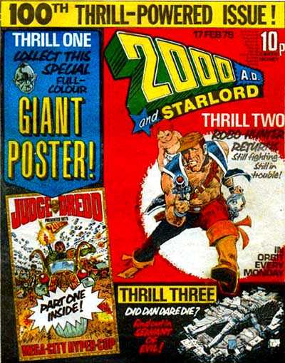 Historic 100th issue of 2000AD. After being left hanging after part nine (prog 84), Sam Slade: Robo-Hunter is back for the concluding run of his first story - Verdus. Dan Dare returns, picking up from the cliff-hanger at the end of prog 85 (written by Tom Tully, who would go on to write DD in the relaunched Eagle). Also this prog, the start of a four-part collectable Judge Dredd poster in the colour centre-spread.