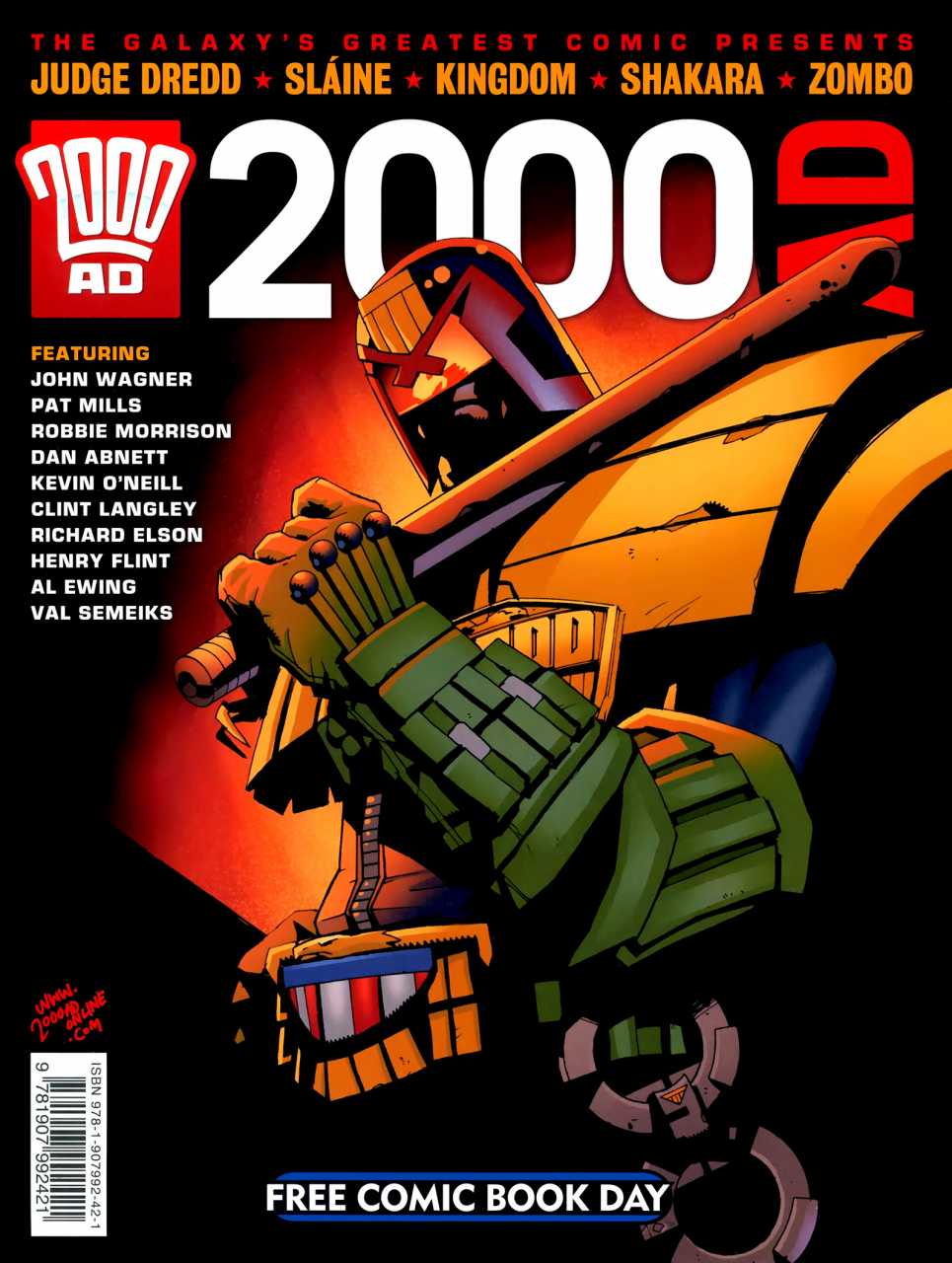 Tharg the Mighty - Tharg and the Intruder (reprint from 2000AD prog 24) (script/art: Kevin O'Neill)Judge Dredd - S.A.M. (reprint from 2000AD prog 1374) (John Wagner - Val Semeiks/Cliff Robinson)Slaine - The Books of Invasions - Moloch (part 1) (reprint from 2000AD annual Prog 2003) (Pat Mills - Clint Langley)Kingdom (part 1) (reprint from 2000AD annual Prog 2007) (Dan Abnett - Richard Elson)Shakara (part 1) (reprint from 2000AD annual Prog 2002) (Robbie Morrison - Henry Flint)Obmoz battles the Twinkie Winkler (art: Henry Flint)2000AD Free Comic Book Day (FCBD) (2011)