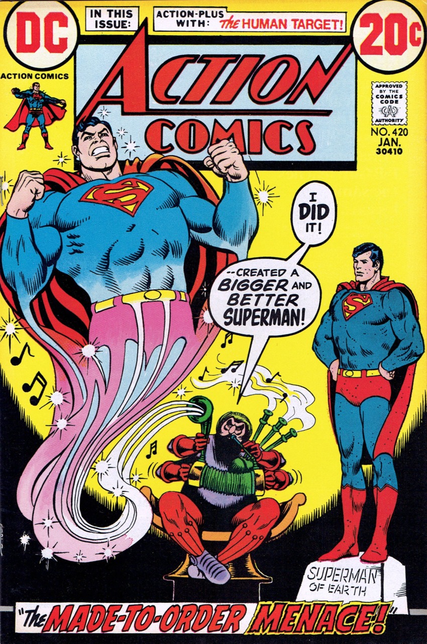 Cover by Nick Cardy."The Made-to-Order Menace!" (Superman) written by Elliot S. Maggin, penciled by Curt Swan and inked by Murphy Anderson."The King of the Jungle Contract!" (Human Target) written by Len Wein, penciled and inked by Dick Giordano.Note: Perry White and Morgan Edge cameo headshots only.