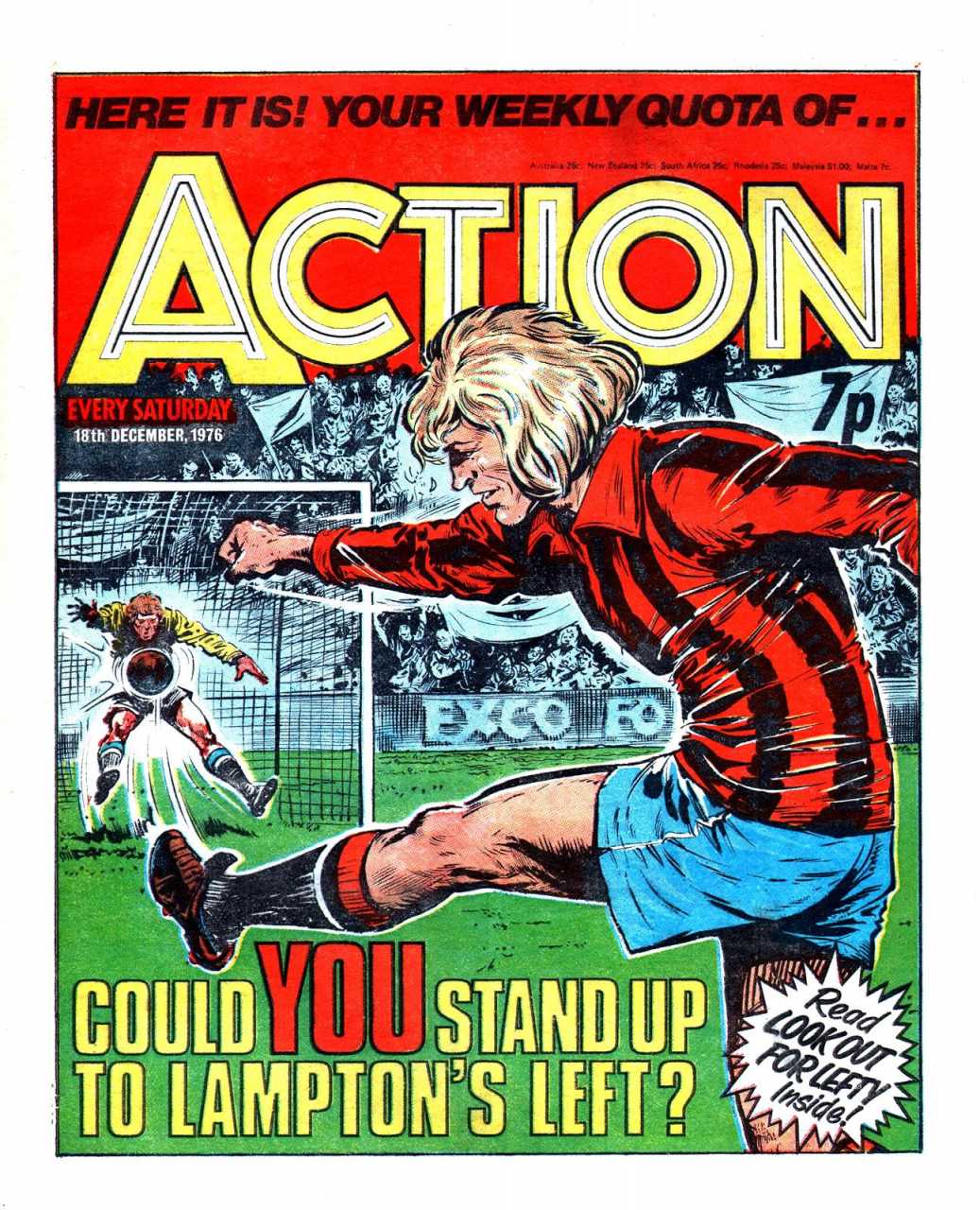 Action was a controversal weekly British comic published by IPC Magazines. It ran for 36 issues before IPC suspended the publication for 6 weeks due to pressure from the media. When it returned most of the violence was watered down or removed altogether. It then lasted for a further 50 issues before merging with Battle Picture Weekly in November 1977.