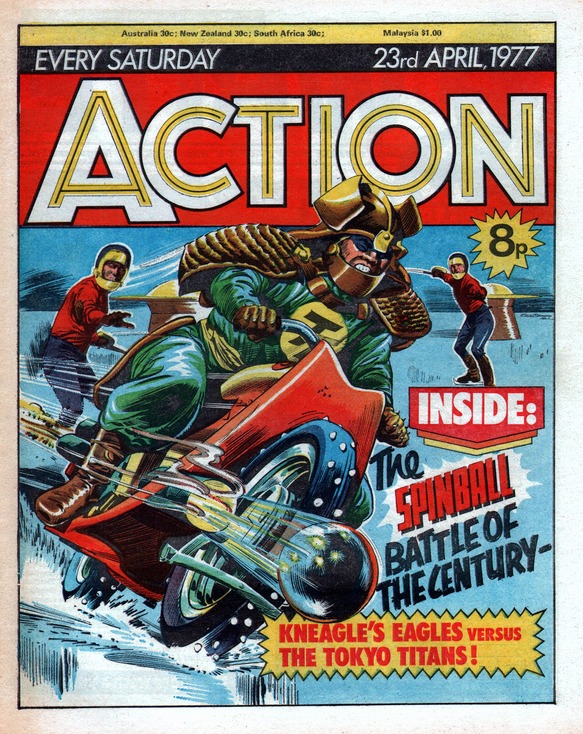 Action was a controversal weekly British comic published by IPC Magazines. It ran for 36 issues before IPC suspended the publication for 6 weeks due to pressure from the media. When it returned most of the violence was watered down or removed altogether. It then lasted for a further 50 issues before merging with Battle Picture Weekly in November 1977.