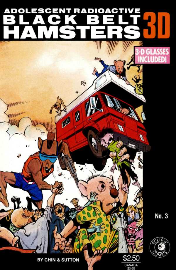 The main title of the Adolescent Radioactive Black Belt Hamsters, a low-budget black and white comic, started unexpectedly selling like hotcakes right out of the gate. Its creators jumped on its success and started making spin-off series like ARBBH 3-D right away. The 3-D series partly tied into the main series' continuity and played experimentally with its 3-D characteristics.