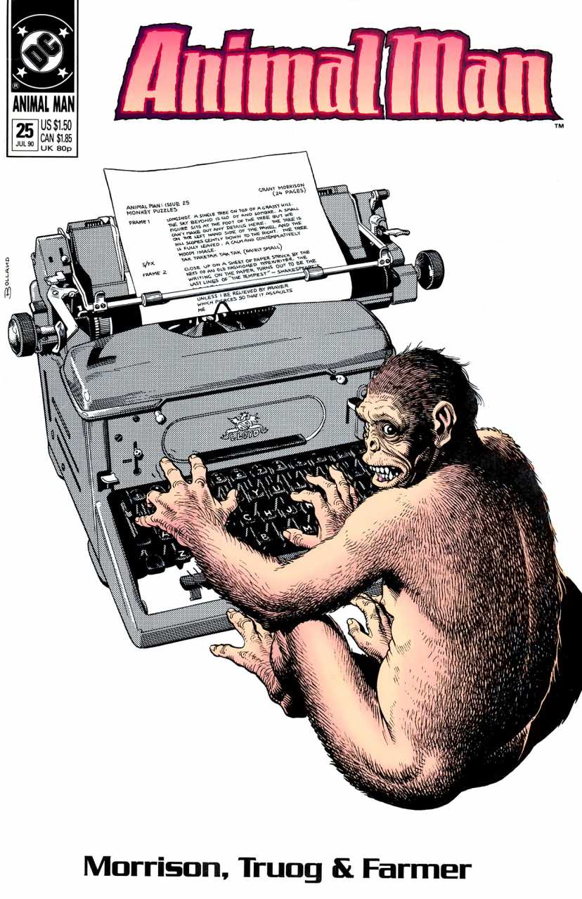Animal Man is in Comic Book Limbo! What is this surreal place? Who is really Buddy Baker? A monkey sits in a field, under a tree, typing out Shakespeare on a typewriter. Meanwhile, Buddy prepares to leave his house and go journeying through the moody cem ...