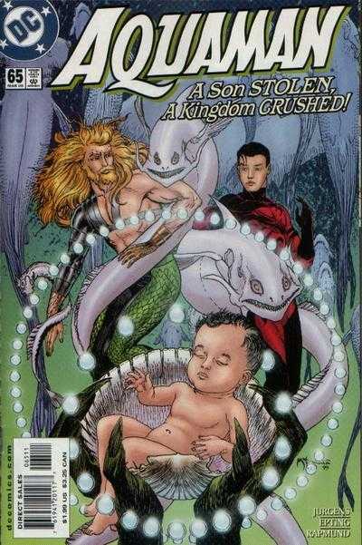 Atlantis is slowly rising from the bottom of the sea and Vulko and other scientists are looking into this. Issue 9 showcases the villain, Deadline and he is hired by Atlantis King Thesily to destroy Aquaman. The Sea King gets a new grappling hook for his arm that is telepathically controlled and can be used in various functions. So this issue showcases Aquaman's ability to perform as a hero outside of his watery realm. Koryak is embraced by the people of Atlantis and he envisions himself ruling one day. King Thesily dies in an attempt to murder Koryak and he refuses to help him as another earthquake shakes Atlantis. By issue 11, Koryak leads the Atlanteans out of Atlantis to seek their destiny, while Aquaman and Dolphin stay back. At the end of issue 11 Aquaman and Dolphin take their relationship to the next level and the issue ends with a surprise guest Mera. Thanatos returns and traps Aquaman and Dolphin in his realm while he goes at with the blue costume as the new Aquaman. He apparently meets his fate at the end of issue 14 at the hads of Major Disaster, in an Underworld Unleashed Crossover. Aquaman finds out that Mera and a boy named AJ have lived in Thanatos' Realm. AJ cannot exist in this realm without severe aging. So he has to stay and Mera goes back with him. Mera did say that AJ may be Aquaman's son (they resemble each other).