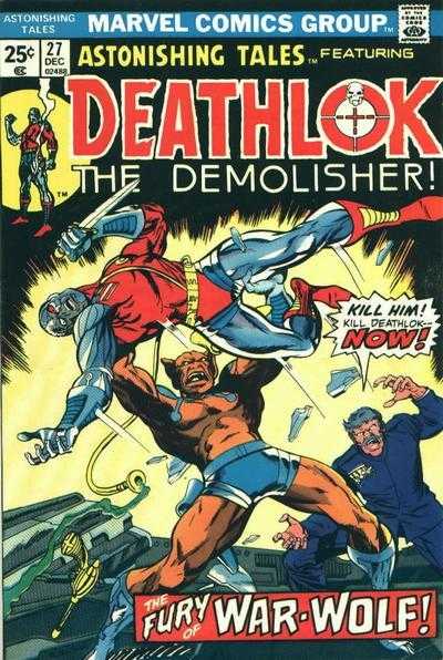 The line up of features in Astonishing Tales changed several times. Starting by featuring Ka-Zar and Doctor Doom, ( Imitating the succesful formulas of Suspense and Astonish) The double feature lasted only 8 issues, before KA-Zar took over upto issue #20. Following 4 issues of IT - the Living Collosus, the remaining issues featured Deathlock the Demolisher (apart from #29, which was a reprint comic starring the Guardians of the Galaxy).