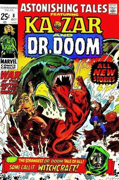 The line up of features in Astonishing Tales changed several times. Starting by featuring Ka-Zar and Doctor Doom, ( Imitating the succesful formulas of Suspense and Astonish) The double feature lasted only 8 issues, before KA-Zar took over upto issue #20. Following 4 issues of IT - the Living Collosus, the remaining issues featured Deathlock the Demolisher (apart from #29, which was a reprint comic starring the Guardians of the Galaxy).