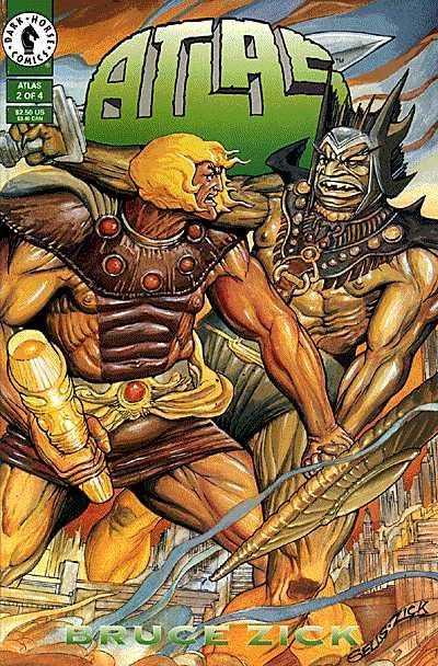 Continuing Bruce Zick's epic story of Atlas and his struggle with the Pantheon of Gods, Atlas battles the monster, Sh'en Chui, and eventually defeats it with the help of GoldenRod. As it turns out, this is just the first in a series of battles Atlas will have to face in order to secure earth from the wrath of his enemies. In this issue, we also see the creation of Atlas' idyllic Mythic Oasis, the return of his arch-nemesis, Bol, from a millennia-long hibernation, the revelation of the Seven Mythic Wonders, and our first glimpse at the ethereal home of the Gods -- Eternia. Eventually, though, the most troubling aspect of Atlas' banishment to earth becomes readily evident -- GoldenRod is losing power!
