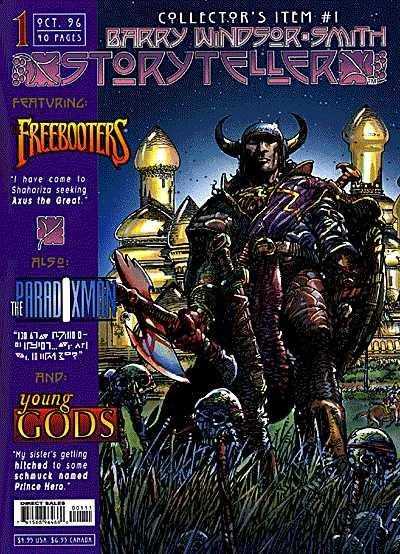 The debut of the new, large-format monthly comic-book extravaganza created, written, and drawn by comics superstar Barry Windsor-Smith. The special 40-page premiere introduces the three original series that will appear in every issue! The Freebooters recounts the quest of young Aran Ana-Kashan through the worlds of sword and sorcery to enlist the aid of Axus the Great, proclaimed mightiest hero in the world, in a desperate attempt to avoid global cataclysm. The retired Axus, however, has other plans. The series for which the fans of Barry's original Conan and Archer and Armstrong have been waiting! The Paradoxman follows Tristan Caine, an unwilling time traveler, as he is buffeted about the ages on the fractious TimeBike. Caine's encounters with everything from dinosaurs to space aliens begin to add up to a very disturbing Big Picture. Young Gods introduces a pantheon of mythic stature on the eve of the wedding of Heros, Son of All-Worlds, and the stunning Celestra, Princess of Orgasma; a marriage meant to unite the most grand and powerful worlds of Gods. Never has a case of cold feet had such intergalactic repercussions!