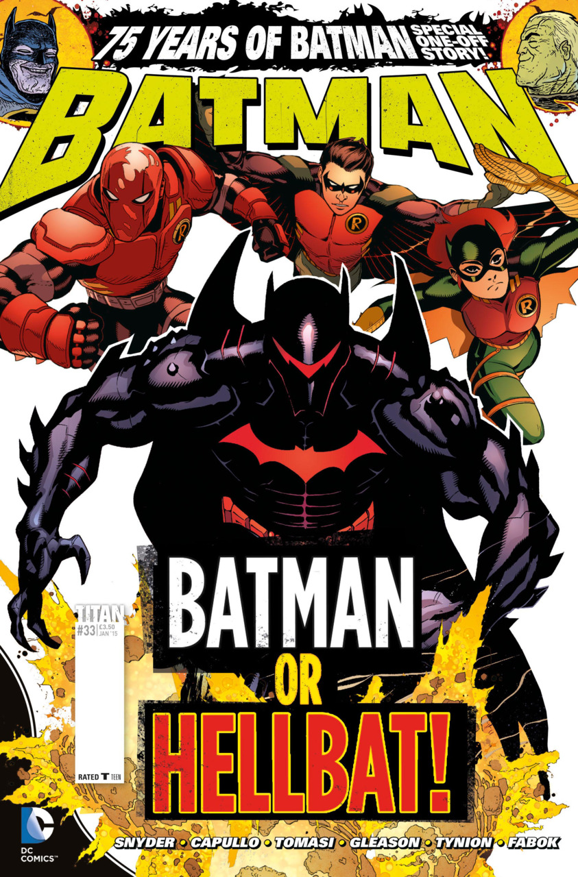 There’s never a moment’s rest for the Caped Crusader, and this issue is no exception! First up, Batman investigates when a terrifying killer begins targeting those people in Gotham who wouldn’t be missed. That is until Batman is on the case. Then, in ‘Robin Rises,’ Batman’s mission to bring back Damian takes him all the way to Apokolips, as the avenging Hellbat! And, last but not least, before Batman: Eternal returns next issue, we bring you a special one-off tale celebrating the Dark Knight’s 75th year!