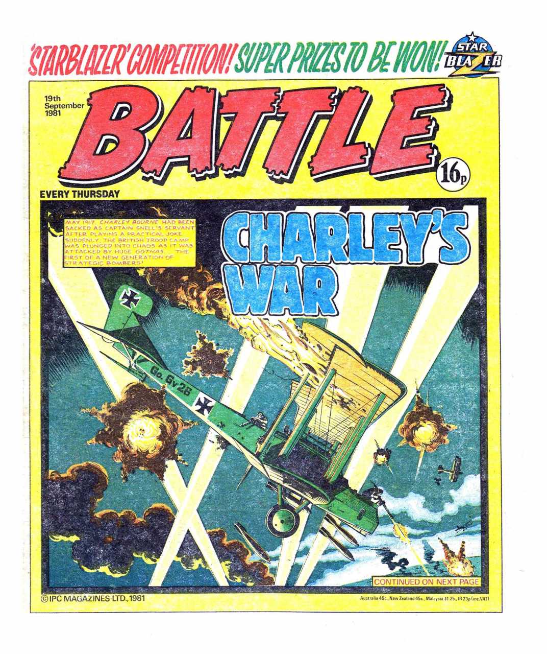 Battle was a weekly British publication for boys with stories about war. There were 664* weekly issues (from 1975 to 1988) until the title merged with Eagle (issue 306).