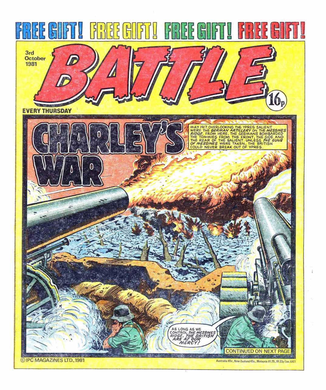 Battle was a weekly British publication for boys with stories about war. There were 664* weekly issues (from 1975 to 1988) until the title merged with Eagle (issue 306).