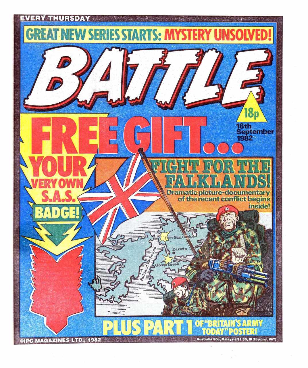 Battle was a weekly British publication for boys with stories about war. There were 664* weekly issues (from 1975 to 1988) until the title merged with Eagle (issue 306).