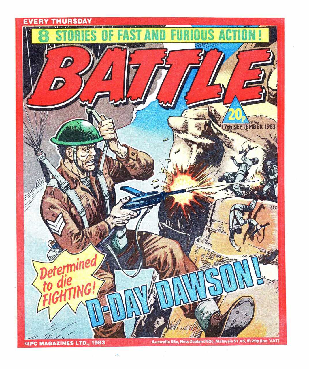Battle was a weekly British publication for boys with stories about war. There were 664* weekly issues (from 1975 to 1988) until the title merged with Eagle (issue 306).