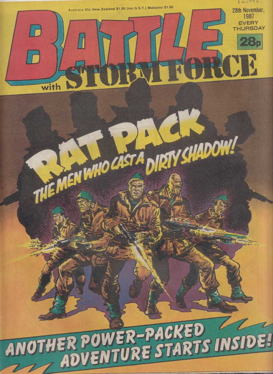 Cover: Carlos Ezquerra (Rat Pack)Johnny Red (art: John Cooper)Battlehawks (art: Don Wazejewski)Lofty's one-man Luftwaffe (reprint)Charley's War (reprint - Pat Mills and Joe Colquhoun)Storm Force (art: Vanyo)Fighting Mann (art: Cam Kennedy)Rat Pack (repri ...