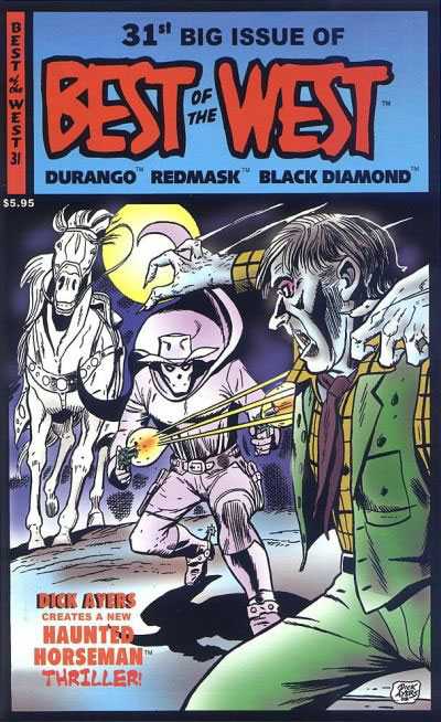 Legendary artist Dick Ayers pencils and inks a NEW Haunted Horseman adventure, “The Corse of the Carpathians!” that lets loose a vampire menace on the Old West! Dick helped create the inspiration for this character over 50 years ago and has his ghostly rider back in the saddle again! Then, Durango Kid pits his prowess against “The Phantom Badhat!”, by Fred Guardineer. Redmask teams up with Wild Bill Hickock, Jesse James and Billy the Kid in “The Men Death Wanted!” by Frank Bolle. Black Diamond faces a “Six Gun Showdown!” in widescreen format by Bill Walton. Rancher Steve Adams is transformed into a White Indian to save “The Boy From Back East!” by Fred Meagher. The Wild West just gets better and better . A never-before-seen, brand new lead story, and crisp,clean full-story reprints originally published by Magazine Enterprises and Lev Gleason. Best of the West size and format, 40 pages, black and white with color covers.
