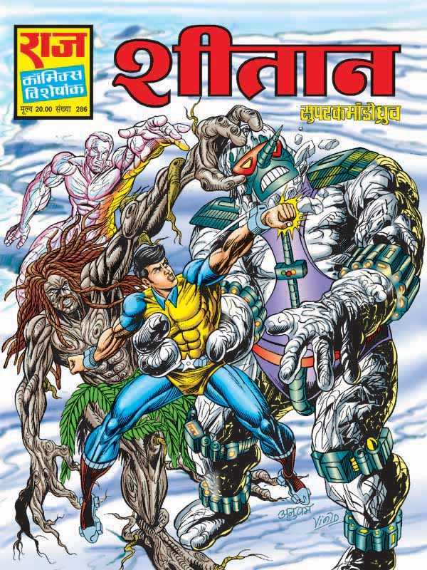 The clock of evolution has been reversed. Mammoth, which was extinct for centuries, has been roaming on the streets of Rajnagar! His arrival has been augmented by snowfall in Rajnagar which was an unprecedented event in itself. Vanputra is attacked by goons who have a particular interest in the cylinders which Vanputra has been carrying along with him. Before things get out of control Dhruv joins the fight and manages to save Vanputra! On interrogation Dhruv finds out these goons were hired on contract to steal these cylinders. The mammoth and a snow robot attack a factory in Rajnagar which specialized in making coolants. Dhruv and Vanputra are joined by Dr. Varghese. Dr. Varghese tests the gasses contained in the cylinders and concludes that these gasses are very high grade refrigerants. A new breed of living being comes to Rajnagar in their quest for these refrigerants. They acknowledge themselves as Sheetans and begin to cause mayhem in the town. Now Dhruv and Vanputra are out to confront these creatures. Will they best the odds and win over these ice monsters. Who are these mysterious monsters? What is their motive behind stealing these refrigerants? Enjoy the chill in an exciting adventure with an unexpected twist in the story exclusively at Raj Comics!