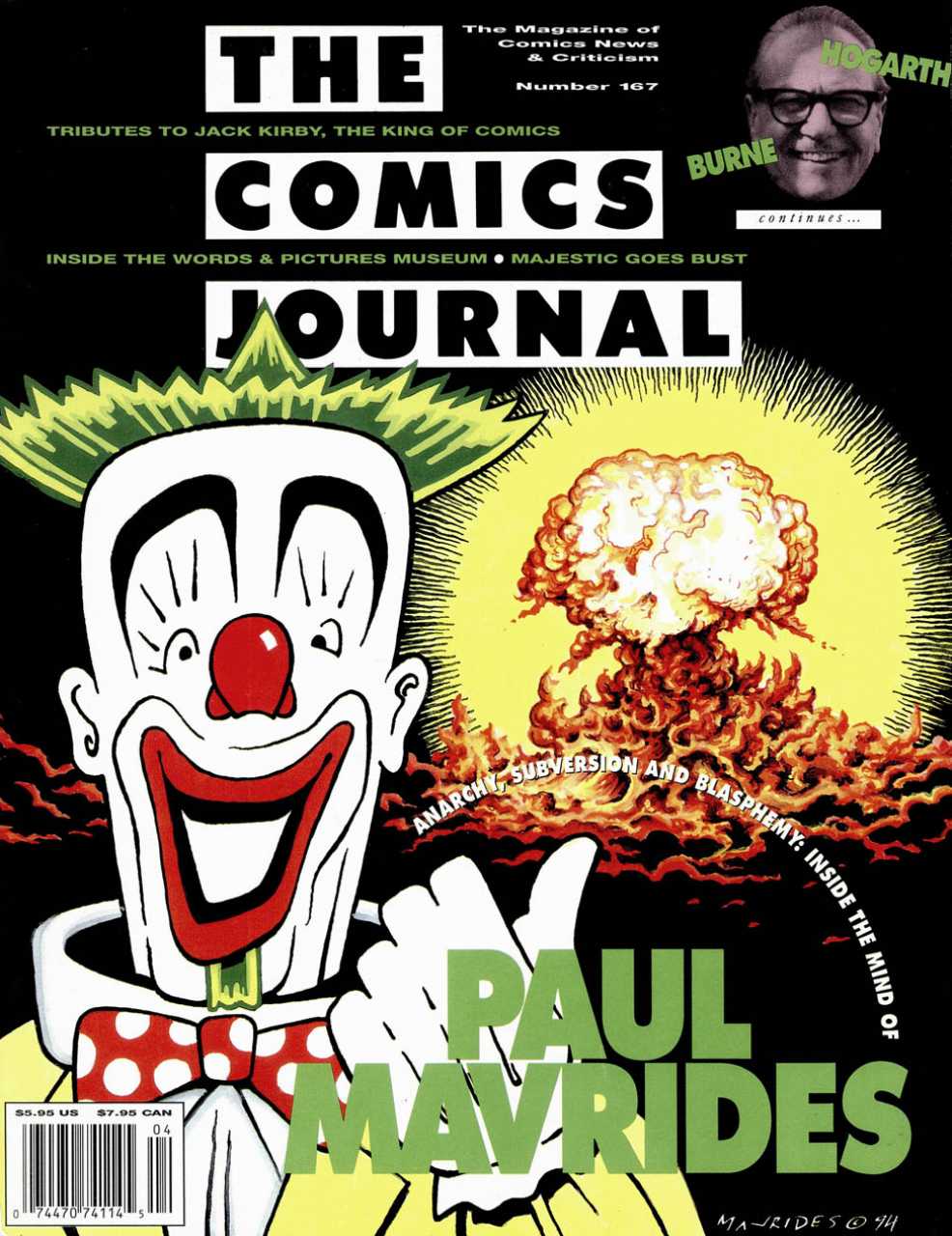 A two-sided flip-book issue. On one side: Who is Paul Mavrides? The Comics Journal tells all in April 1994, but to give you a hint, he happens to be the lone cartoonist taking on the California State Tax Board's landmark decision that comic books are not artistic expression. Need more? How 'bout: The Church of the SubGenius, The Fabulous Furry Freak Brothers in "The Idiots Abroad," graphic design for director Alex Cox, Anarchy Comics, RE/SEARCH, The New Yorker, velvet paintings, The Realist, American Splendor, gum cards, Village Voice, Heavy Metal, and High Times? If you want to hear from a man behind the scenes on all these phenomena, pick up The Comics Journal #167. You'll also find the second and concluding half of the definitive interview with Burne Hogarth, creator of Dynamic Anatomy and Tarzan in the comics!
