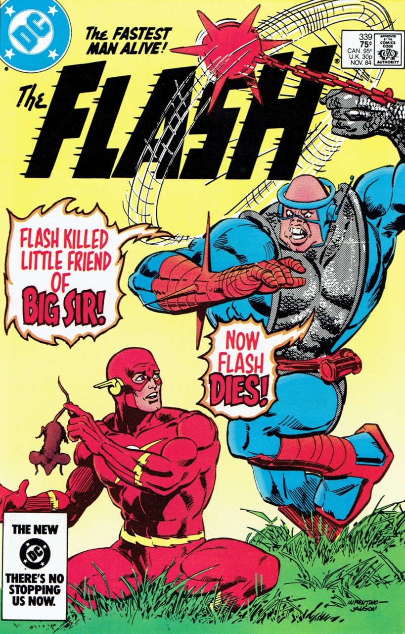 Cover by Carmine Infantino and Klaus Janson."Warday!" written by Cary Bates, penciled by Carmine Infantino, inked by Frank McLaughlin, colored by Carl Gafford and lettered by Ben Oda.The Flash's Rogues Gallery have abducted a mentally-handicapped monster of a man, and outfitted him with armor and armaments. The Rogues dub him "Big Sir". The Trickster, using the Flash's boots, stolen from the Flash Museum, sets up a false trail, seemingly left by the Flash. Upon waking, Big Sir sees the five Rogues laid out, unconscious, before him. Defense Attorney, Cecile Horton, interviews Doctor Henry and Nora Allen. The Allens recount their perception of the series of events that led up to the Flash killing Professor Zoom, the notorious Reverse Flash.