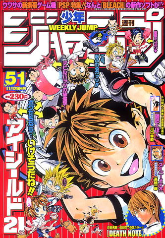 1•2 no Ahho!! (1・2のアッホ!!) Shueisha #349 (1975) - #497 (1978)1970 Tagiri (1970たぎり)4 Tarō 1 Hime (4タロウ1ヒメ) Bizarre, Inc. #115 (1971) - #129 (1971)A•O•N (エーオーエヌ) ShueishaAa Ichiro (ああ一郎) ShueishaAa! Bishamon Kōkō (嗚呼!!毘沙門高校) ShueishaAbare Jirō (あばれ次郎)Ace! (エース!)Aitsu! (あいつ!)Akaboshi: Ibun Suikoden (AKABOSHI -異聞水滸伝-) ShueishaAkagami no Ōkami (赤毛の狼)Akaten Kyōshi Nashimoto Kotetsu (アカテン教師梨本小鉄) ShueishaAkatsuka Gag Shōtaiseki (赤塚ギャグ招待席)Akkera Kanjinchō (あっけら貫刃帖)Akutare Kyojin (悪たれ巨人) ShueishaAlbatross Tonda (アルバトロス飛んだ)Ama Gonzui (海人ゴンズイ)Anedoki (あねどきっ) Shueisha #2033 (2009) - #2058 (2010)Animal Kenshi (アニマル拳士)Animal Kyūjō (アニマル球場)Ankoku Shinwa (暗黒神話)Aozora Fishing (青空フィッシング) ShueishaArakkure! (荒っくれ!)Arashi! San-piki (あらし!三匹)Asatarō-den (朝太郎伝)Ashita Tenpei (あした天兵)Ashita wa Tsukameru ka (明日はつかめるか)Asklepios (アスクレピオス)Assassination Classroom (暗殺教室) Shueisha - Viz Media - Kana - Carlsen - Panini #2176 (2012) - #2355 (2016)Astro Kyūdan (アストロ球団) ShueishaAT Lady! (AT Lady! (オートマティック・レディ))Bakabakashino! (バカバカしいの!)Bakudan (ばくだん)Bakuhatsu Yarō (爆発野郎)Bakuhatsu! Uchū Kuma-san Tāta Bear & Kikuchiyo-kun(爆発!宇宙クマさんタータ・ベア&菊千代くん)Bakuman (バクマン。) Shueisha - Viz MediaBaō Raihōsha (バオー来訪者) ShueishaBara no Sakamichi (ばらの坂道)Baramon no Kazoku (瑪羅門の家族)Bari Haken (バリハケン) ShueishaBase BoysBastard!! -Ankoku no Hakaishin- (BASTARD!! -暗黒の破壊神-) Shueisha - Viz MediaBe Takuto!! ~Yaban Nare~ (BE TAKUTO!! 〜野蛮なれ〜)Beelzebub (べるぜバブ) ShueishaBelmonde Le VisiteuR (ベルモンド Le VisiteuR)Beshari Kurashi (べしゃり暮らし) ShueishaBest Blue (ベストブルー) Shueisha #2322 (2015) - #2340 (2015)Big 1Big Gun (ビッグガン)Bijōmaru (美女丸)Bikubiku Nyanko (びくびくニャンコ)Black Angels (ブラック・エンジェルズ)Black Cat (ブラックキャット) Shueisha - Viz MediaBlack Clover (ブラッククローバー) Shueisha #2302 (2015) - OngoingBlack Eagle (ブラックイーグル)Black Knight Bat (BLACK KNIGHT バット)Black Pro Fighter Takeru (ブラックプロファイター タケル)Bleach (ブリーチ) Shueisha - Viz Media #1652 (2001) - OngoingBlue City (ブルーシティー)Blue Dragon RalΩGrad (BLUE DRAGON ラルΩグラド) Shueisha - Viz MediaBobobōbo Bōbobo (ボボボーボ・ボーボボ) Shueisha - Viz MediaBogī The Great (ボギー THE GREAT)Bokke-san (ぼっけさん)Boku ga Shitakata-kun (ボクはしたたか君)Boku no Dōbutsuen Nikki (ぼくの動物園日記) ShueishaBoku no Watashi no Yusha Gaku (ぼくのわたしの勇者学)Boku wa Shōnen Tantei Dan♪♪ (僕は少年探偵ダン♪♪)Boku-tachi no Sensen (ぼくたちの戦線)Bomber GirlBonbonzaka High Drama Club (ボンボン坂高校演劇部)Boronbo-sensei (ボロンボ先生)Bōsō Hunter (暴走ハンター)BØY (ボーイ) ShueishaBremen (無頼男 -ブレーメン-)Buddy Strike (バディストライク) Shueisha #2339 (2015) - #2349 (2016)Bun no Ao Shun! (ブンの青シュン!)Bushizawa Receive (武士沢レシーブ)Busō Renkin (武装錬金) Shueisha - Viz MediaButsu Zone (仏ゾーン) Shueisha #1437 (1997) - #1455 (1997)Can☆Can Every Day (CAN☆キャンえぶりでい)Captain Tsubasa (キャプテン翼) ShueishaCaptain Tsubasa: World Youth (キャプテン翼―ワールドユース) ShueishaCat's♥Eye (キャッツ♥アイ) ShueishaChagecha (チャゲチャ)Chameleon Jail (カメレオンジェイル) ShueishaChange Up!! (チェンジUP!!)Chibi (CHIBI-チビ-)Chichi no Tamashii (父の魂) Shueisha #1 (1968)Chijō Saisoku Seishun Takkyu Pūyan (地上最速青春卓球少年ぷーやん)ChildragonChinyūki -Tarō to Yukai na Nakama-tachi- (珍遊記 -太郎とゆかいな仲間たち-)Chōdokyū Senshi Justice (超弩級戦士ジャスティス)Chokidō Bōhatsu Shūkyū Yarō Riboro no Takeda (超機動暴発蹴球野郎 リベロの武田)Chōkidōin Vander (超機動員ヴァンダー)Chōsensha Kēn (挑戦者ケーン)Circuit no Ōkami (サーキットの狼)City Hunter (シティーハンター) Gutsoon - ShueishaClaymore (クレイモア) Shueisha - Viz MediaClimb Sweeper (クライム・スイーパー)Cobra (コブラ) Dybex - Viz MediaCommander 0 (コマンダー0)Condor no Tsubasa (コンドルの翼)Cool -Rental Body Guard- ShueishaCorrector M&Y (神力契約者M&Y)Cosmos End (コスモスエンド)Cosmos Striker (コスモスストライカー)Cowa! (こわ!) Shueisha - Viz Media #1471 (1997) - #1488 (1998)Crisis Diver (クライシスダイバー)Cross Manage (クロス・マネジ) ShueishaCyber Blue (CYBERブルー)Cyborg Jīchan G (CYBORGじいちゃんG) ShueishaD.Gray-man Shueisha - Viz MediaD•N•A² ~Dokokade Nakushita Aitsuno Aitsu~ (D・N・A² 〜何処かで失くしたあいつのアイツ〜) ShueishaDaisuō -Dice King- (大好王 -ダイスキング-)Death Note (デスノート) Shueisha - Viz Media #1764 (2004) - #1881 (2006)Deguchi Kyodai Funsenki (出口兄弟奮戦記)Delorinman (デロリンマン)Den'ei Shōjo (電影少女)Dengyan -Nanpō Kumagusu-den- (てんぎゃん -南方熊楠伝-)Devily Man (デビリーマン) Shueisha #2315 (2015) - #2330 (2015)Diamond (ダイヤモンド)Diamond Star (ダイヤモンドスター)Doberman Deka (ドーベルマン刑事) ShueishaDōdō Yarō (どうどう野郎)Dogashi Kaden! (どがしかでん!)Dohazure Tenkaichi (どはずれ天下一)Dois Sol (ドイソル) ShueishaDokonjō Gaeru (ど根性ガエル) ShueishaDon Vulcan -Seinaru Otoko no Densetsu- (ドン・ボルガン -聖なる男の伝説-