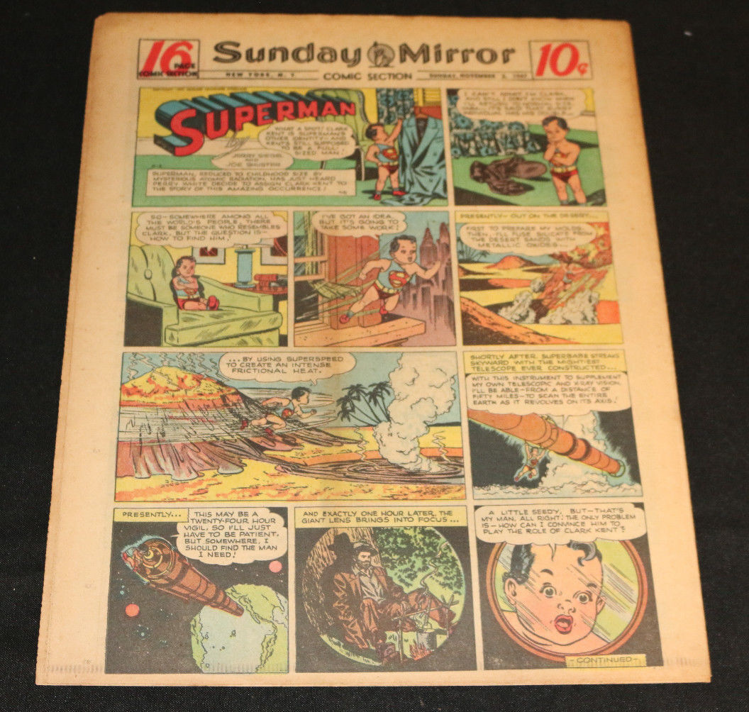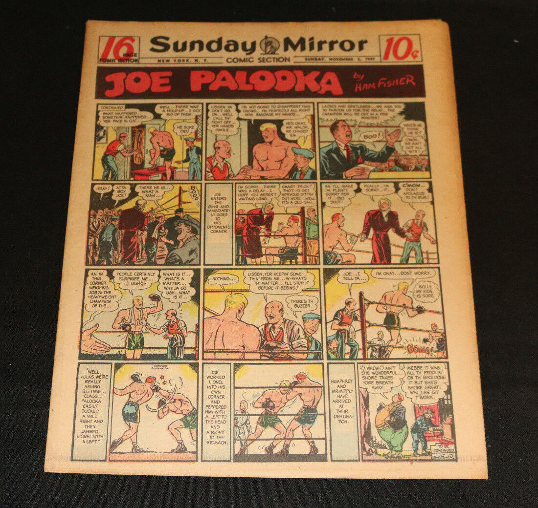 Condition: Never been folded.1947 Sunday Mirror Weekly Comic Section November 2nd (F+) Superman Joe PalookaSize: 11.5" x 14.5"This item was uploaded by Shannon.If there are any problems with your order whatsoever, please message us before leaving feedback and we'll be happy to work with you to fix the situation! We ship worldwide, combine purchases, and charge exact shipping. The price may vary based on size, weight, and location. If you are automatically overcharged for shipping, message us and we'll be happy to revise the invoice or refund you the excess amount. If you have any questions regarding shipping, please message us. International Buyers – Please Note: Import duties, taxes, and charges are not included in the item price or shipping cost. These charges are the buyer's responsibility. Please check with your country's customs office to determine what these additional costs will be prior to bidding or buying. Payment can be made by PayPal and credit cards directly. PLEASE SEE MY ABOUT ME PAGE FOR 1000'S OF PICTURED ART PAGES AVAILABLE Frequently Asked Questions: Is the item pictured the exact one for sale?Yes! We don't use stock images and go through great lengths to scan or photograph everything we list. The item pictured is exactly what you should receive UNLESS it is a fixed price listing with multiple items available. How do you grade?Grading is very subjective, but we are professionals with decades of grading experience between us who try the best we can to accurately describe the condition of the items we list. Anthony is an Overstreet Comic Book Price Guide Advisor Please see the grading chart below for a breakdown of how we grade: 10.0 GM Gem Mint 9.9 M Mint 9.8 NM/M Near Mint/Mint 9.6 NM+ Near Mint+ 9.4 NM Near Mint 9.2 NM- Near Mint- 9.0 VF/NM Very Fine/Near Mint 8.5 VF+ Very Fine+ 8.0 VF Very Fine 7.5 VF- Very Fine- 7.0 FN/VF Fine/Very Fine 6.5 FN+ Fine+ 6.0 FN Fine 5.5 FN- Fine- 5.0 VG/FN Very Good/Fine 4.5 VG+ Very Good+ 4.0 VG Very Good 3.5 VG- Very Good- 3.0 GD/VG Good/Very Good 2.5 GD+ Good+ 2.0 GD Good 1.8 GD- Good- 1.5 FR/GD Fair/Good 1.0 FR Fair 0.5 PR PoorWhat is your base shipping for comics? Our base ship method will be in a media box for $5.00 domestic. If it says expedited $5.60 that’s a typo! Base shipping price you see is for your item to be shipped very well in the appropriate box. We spend money on these boxes to protect during shipping so you can be confident your item will arrive securely. Do you combine shipping? Yes, of like items. Such as: several comics can fit in one media box, as can more than one record. Multiple art pages can easily be combined because they are light and thin. Where combined shipping differs is with size and weight. For instance, two statues require a much bigger box. Same goes for CGCs, as the package gets bigger and heavier as you go. Do you ship well? I’ve had some bad experiences… You needn’t worry; we are professionals who value your business and want your item to arrive safely as much as you do. I have been collecting for over 30 years. I send out items the way I would like to receive them. The tracking says my item is "OUT FOR DELIVERY" in New Jersey. Why is that?If the tracking indicates that the item is "OUT FOR DELIVERY" in NJ don't worry, it's just what the tracking says when it's carried over from the postman to the sorting center. This is normal for our Post Office and will not impact you receiving your item in a timely matter.What is the difference between a RUN and a LOT?Good question. A RUN will be a collection of consecutive issues with no breaks in between them. If it says RUN of #s 1 - 50 you will receive 50 consecutive comics. A LOT will be within a certain range, so a 50pc LOT will not contain consecutive books.I changed my mind after successfully winning the auction or fixed price listing, will you cancel the transaction? Please only bid or hit BUY IT NOW if you are willing to follow through and pay for the item, we will not cancel the transaction. As a seller, Hip penalizes us every time we cancel an order, so it is detrimental to our business to do so. Therefore if you will not pay, then you'll have to let Hip cycle this to an “unpaid item” and accept whatever action Hip deems necessary. See ABOUT ME for 1000's of original art pages in stock MEET OUR STAFF: "At Anthony's Comic Book Art we're caffeinated to give you excellent customer service!" Pictured left to right: Nicole, Connelly, Bobby, Anthony, Shannon, Amanda, and ChrisAS SEEN ON TV: I have been buying and selling artwork and comics for about 20 years. If you are new to buying art or comics feel free to ask any questions that you may have. See ABOUT ME for 1000's of original art pages in stock Small, Regular, and Large Portfolios available; see my Hip store! Froo | Froo Cross Sell, Free Cross Sell, Cross promote, Hip Marketing, Hip listing Apps, Hip Apps, Hip Application