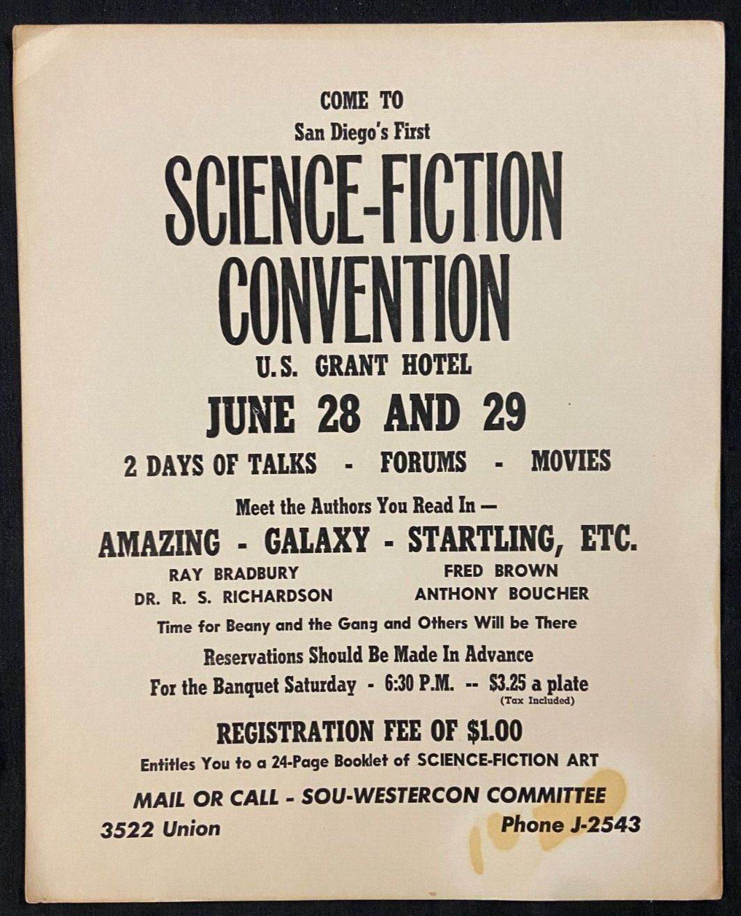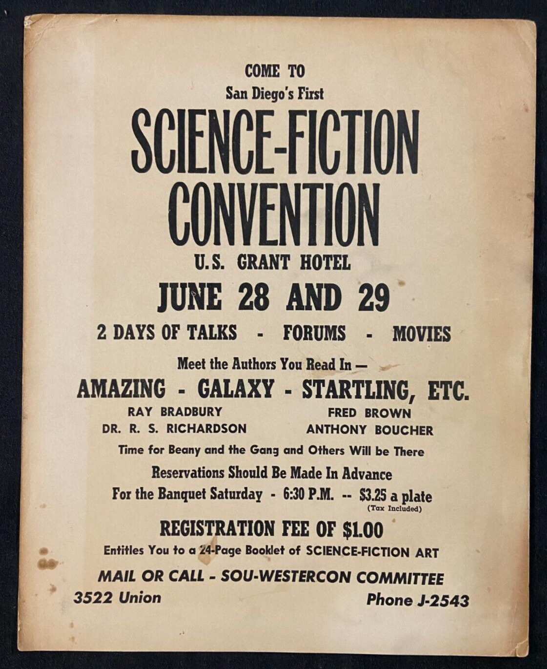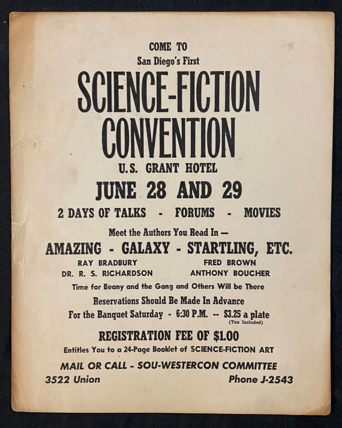 1952 1ST SAN DIEGO "SCI FI CONVENTION" PROMO POSTER (BEFORE SDCC) RARE FN/VF