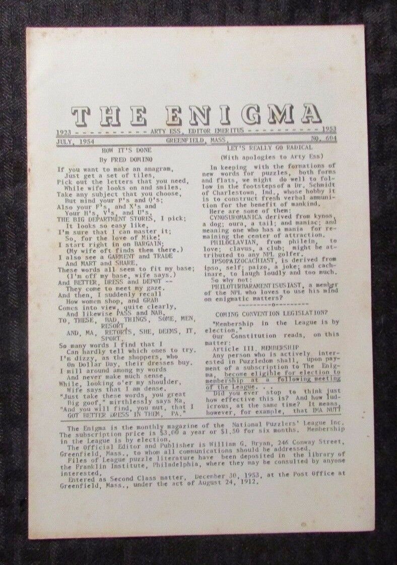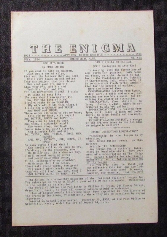 1954 THE ENIGMA Puzzle Fanzine #604 VG+ 4.5 Crosswords Cryptograms 8pgs