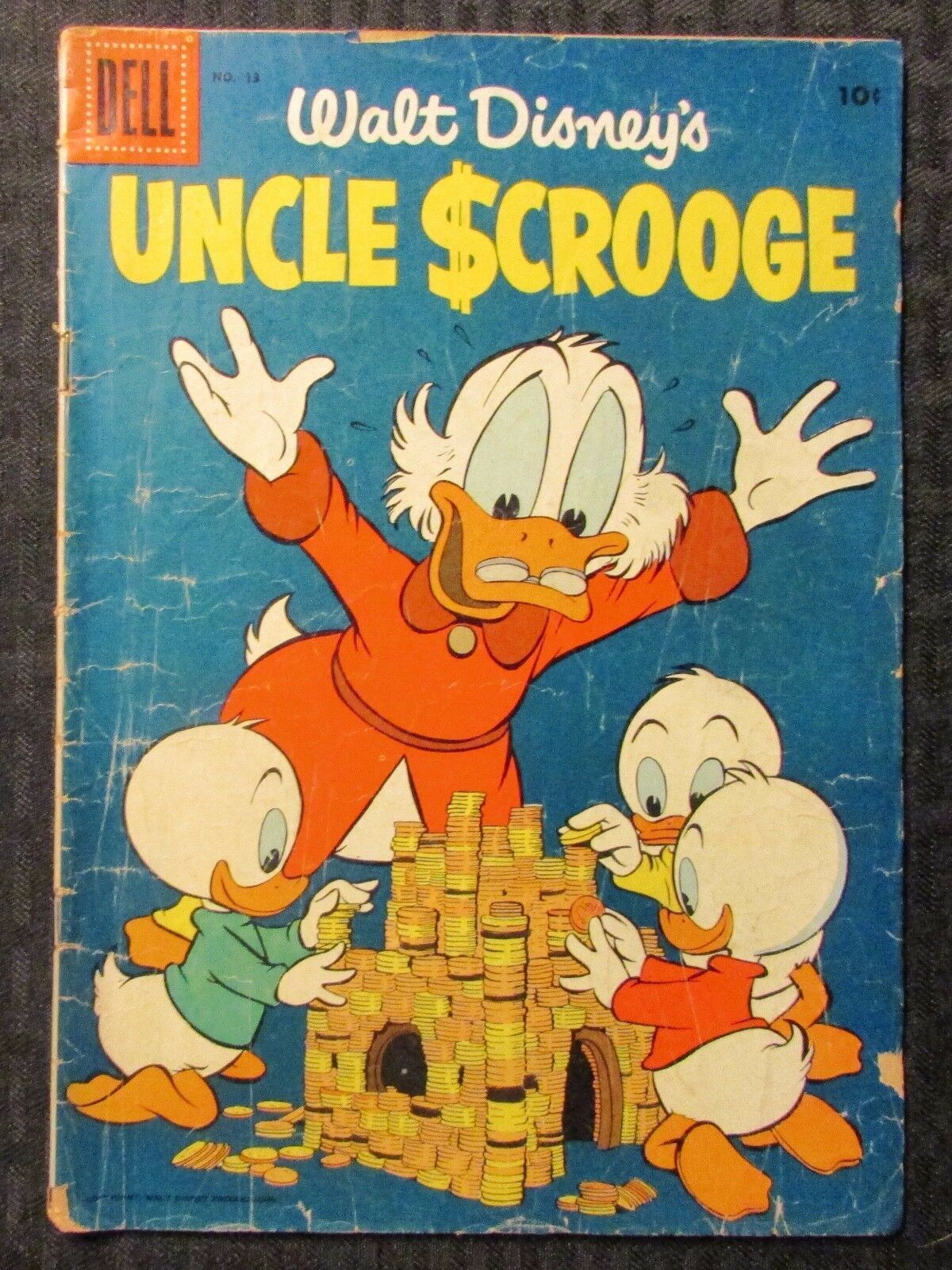 1956 Walt Disney UNCLE SCROOGE #13 GD+ 2.5 DellCondition/Grade: GD+ , creasing , edge damage , spine stress , tanning to edges , SEE PICS!!!Item pictured is item you are bidding on. All items are original & complete unless oherwise noted.This item was uploaded by DG.If there are any problems with your order whatsoever, please message us before leaving feedback and we'll be happy to work with you to fix the situation!We ship worldwide, combine purchases, and charge exact shipping. The price may vary based on size, weight, and location. If you are automatically overcharged for shipping, message us and we'll be happy to revise the invoice or refund you the excess amount. If you have any questions regarding shipping, please message us.International Buyers – Please Note: Import duties, taxes, and charges are not included in the item price or shipping cost. These charges are the buyer's responsibility.Please check with your country's customs office to determine what these additional costs will be prior to bidding or buying.Payment can be made by PayPal and credit cards directly.65,000+ items in total in my Hip store!Frequently Asked Questions:Is the item pictured the exact one for sale?Yes! We don't use stock images and go through great lengths to photograph everything we list. The item pictured is exactly what you should receive UNLESS it is a fixed price listing with multiple items available.How do you grade?Grading is very subjective, but we are professionals with decades of grading experience between us who try the best we can to accurately describe the condition of the items we list.Anthony is an Overstreet Comic Book Price Guide AdvisorDo you combine shipping?Yes, of like items. Such as: several comics can fit in one cardboard mailer, as can more than one record. Multiple art pages can easily be combined because they are light and thin. Where combined shipping differs is with size and weight. For instance, two statues require a much bigger box. Same goes for CGCs, as the package gets bigger and heavier as you go.Do you ship well? I’ve had some bad experiences…You needn’t worry; we are professionals who value your business and want your item to arrive safely as much as you do. I have been collecting for over 30 years. I send out items the way I would like to receive them. The tracking says my item is "OUT FOR DELIVERY" in New Jersey. Why is that?If the tracking indicates that the item is "OUT FOR DELIVERY" in NJ don't worry, it's just what the tracking says when it's carried over from the postman to the sorting center. This is normal for our Post Office and will not impact you receiving your item in a timely matter.What is the difference between a RUN and a LOT?Good question. A RUN will be a collection of consecutive issues with no breaks in between them. If it says RUN of #s 1 - 50 you will receive 50 consecutive comics. A LOT will be within a certain range, so a 50pc LOT will not contain consecutive books.I changed my mind after successfully winning the auction or fixed price listing, will you cancel the transaction?Please only bid or hit BUY IT NOW if you are willing to follow through and pay for the item, we will not cancel the transaction. As a seller, Hip penalizes us every time we cancel an order, so it is detrimental to our business to do so. Therefore if you will not pay, then you'll have to let Hip cycle this to an “unpaid item” and accept whatever action Hip deems necessary.65,000+ items in total in my Hip store!MEET OUR STAFF:"At Anthony's Comic Book Art we're caffeinated to give you excellent customer service!"Pictured left to right: Nicole, Connelly, Bobby, Anthony, Shannon, Amanda, and ChrisAS SEEN ON TV Anthony is always interested in doing business and answering your questions. If you are new to collecting or have something to sell, feel free to ask any questions that you may have.65,000+ items in total in my Hip store!Small, Regular, and Large Portfolios available; see my Hip store!