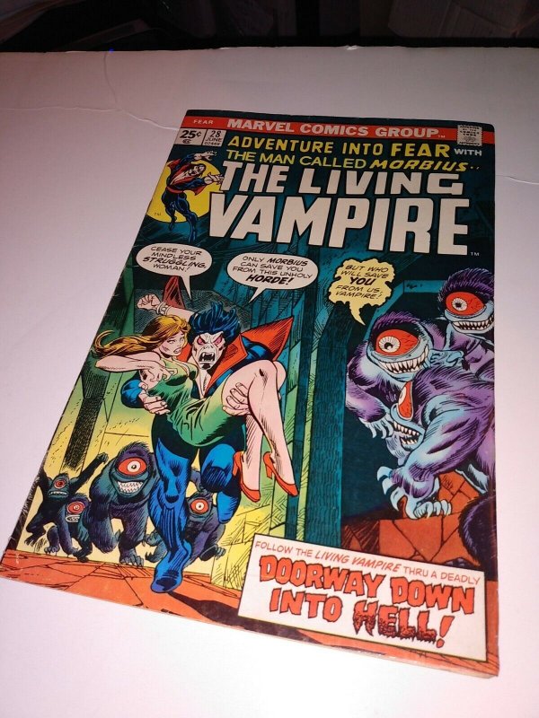 Grade: 4.0 Very Good1975 Adventure Into Fear 28 Morbius and Simon Stroud appearance Very Good condition MORBIUS solo story Shipped with USPS
