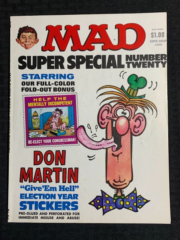 Condition: Condition/Grade: VG+ 4.5 , creasing , tanning to edges , SEE PICS!!!1976 MAD SUPER SPECIAL Magazine #20 VG+ 4.5 w/ Don Martin Stickers Insert (back cover folded)This item was listed by DG.If you have any specific questions or requests, please ask us prior to ordering and we'll get back to you as soon as we can. If there are any problems with your order whatsoever, please message us before leaving feedback and we'll be happy to work with you to fix the situation! We ship worldwide, combine purchases, and charge exact shipping. The price may vary based on size, weight, and location. If you are automatically overcharged for shipping, message us and we'll be happy to revise the invoice or refund you the excess amount. If you have any questions regarding shipping, please message us.International Buyers - Please Note: Import duties, taxes, and charges are not included in the item price or shipping cost. These charges are the buyer's responsibility.Please check with your country's customs office to determine what these additional costs will be prior to bidding or buying.YES, WE COMBINE SHIPPING. YES, WE COMBINE SHIPPING. YES, WE COMBINE SHIPPING. I have been buying and selling artwork and comics for about 20 years. If you are new to buying art or comics feel free to ask any questions that you may have.200,000+ items in total in my Hip store!Small, Regular, and Large Portfolios available; see my Hip store!