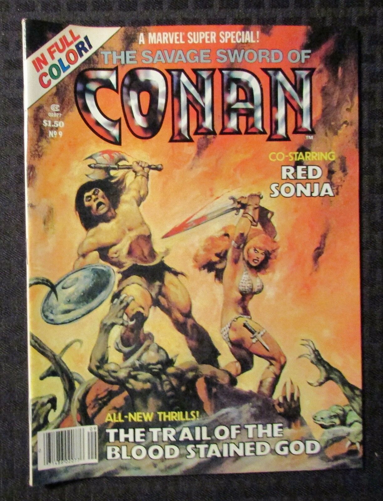 1978 MARVEL SUPER SPECIAL Magazine #9 FN 6.0 Conan The Barbarian / Red SonjaCondition & Grade: FN , tanning to edges , SEE PICS!!!This item was uploaded by DG.If there are any problems with your order whatsoever, please message us before leaving feedback and we'll be happy to work with you to fix the situation!We ship worldwide, combine purchases, and charge exact shipping. The price may vary based on size, weight, and location. If you are automatically overcharged for shipping, message us and we'll be happy to revise the invoice or refund you the excess amount. If you have any questions regarding shipping, please message us.International Buyers – Please Note: Import duties, taxes, and charges are not included in the item price or shipping cost. These charges are the buyer's responsibility.Please check with your country's customs office to determine what these additional costs will be prior to bidding or buying.Payment can be made by PayPal and credit cards directly.65,000+ items in total in my Hip store!Frequently Asked Questions:Is the item pictured the exact one for sale?Yes! We don't use stock images and go through great lengths to photograph everything we list. The item pictured is exactly what you should receive UNLESS it is a fixed price listing with multiple items available.How do you grade?Grading is very subjective, but we are professionals with decades of grading experience between us who try the best we can to accurately describe the condition of the items we list.Anthony is an Overstreet Comic Book Price Guide AdvisorDo you combine shipping?Yes, of like items. Such as: several comics can fit in one cardboard mailer, as can more than one record. Multiple art pages can easily be combined because they are light and thin. Where combined shipping differs is with size and weight. For instance, two statues require a much bigger box. Same goes for CGCs, as the package gets bigger and heavier as you go.Do you ship well? I’ve had some bad experiences…You needn’t worry; we are professionals who value your business and want your item to arrive safely as much as you do. I have been collecting for over 30 years. I send out items the way I would like to receive them. The tracking says my item is "OUT FOR DELIVERY" in New Jersey. Why is that?If the tracking indicates that the item is "OUT FOR DELIVERY" in NJ don't worry, it's just what the tracking says when it's carried over from the postman to the sorting center. This is normal for our Post Office and will not impact you receiving your item in a timely matter.What is the difference between a RUN and a LOT?Good question. A RUN will be a collection of consecutive issues with no breaks in between them. If it says RUN of #s 1 - 50 you will receive 50 consecutive comics. A LOT will be within a certain range, so a 50pc LOT will not contain consecutive books.I changed my mind after successfully winning the auction or fixed price listing, will you cancel the transaction?Please only bid or hit BUY IT NOW if you are willing to follow through and pay for the item, we will not cancel the transaction. As a seller, Hip penalizes us every time we cancel an order, so it is detrimental to our business to do so. Therefore if you will not pay, then you'll have to let Hip cycle this to an “unpaid item” and accept whatever action Hip deems necessary.65,000+ items in total in my Hip store!MEET OUR STAFF:"At Anthony's Comic Book Art we're caffeinated to give you excellent customer service!"Pictured left to right: Nicole, Connelly, Bobby, Anthony, Shannon, Amanda, and ChrisAS SEEN ON TV Anthony is always interested in doing business and answering your questions. If you are new to collecting or have something to sell, feel free to ask any questions that you may have.65,000+ items in total in my Hip store!Small, Regular, and Large Portfolios available; see my Hip store!
