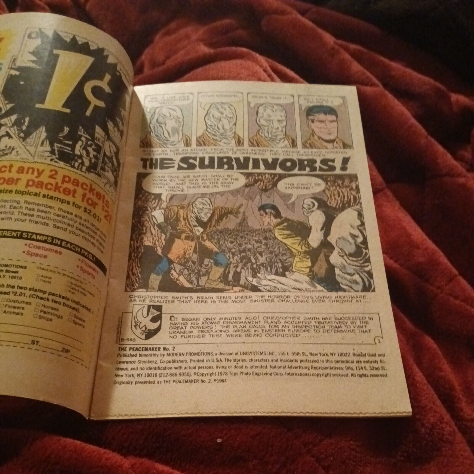Grade: 4.0 Very Good(1978 MODERN COMICS) THE PEACEMAKER #2 Charlton TV show superhero Bronze Age. Modern Comics. Cover by Pat Boyette. The Survivors!, script by Joe Gill, art by Pat Boyette; Peacemaker stops a race of underground shape shifters from taking over the world. The Ultimatum, script by Joe Gill, art by Pat Boyette; Premier Gekk's army is stoped by Peacemaker. The Canadian Caper, script by Joe Gill, art by Bill Montes and Ernie Bache; The Fightin' 5 and their new female member travel to the Arctic to fight Russians. 36 pgs., full color. $0.35. Cover price $0.35. Sadly it grades low as it has bends tears water damage and other defects. I would call it around a 4.0 vg out of 10 condition. See pics and judge for yourself before purchasing as grading is subjective. While we accept returns we do not accept returns for defects that are listed in the description or clearly visible in the pictures regardless of how big or small they are. It is your responsibility as a customer to review any information or pictures given before purchase. The grading is only our opinion and we are not responsible if you choose to have it professionally graded after it leaves our possession or interprit the grading scale differently. We conform to the Overstreet grading guide standards as they have been the gold standard for more than 50 years in the comics industry and are more strict and accurate than most professional graders as they base their grading off of overstreets original grading system. #####add 3 items to your shopping cart and get 5$ off each when you pay for them as one order ##OFFER DOES NOT INCLUDE BEST OFFERS### also as Hip now requires us to click a button that says condition and it auto applies information to our listings the information on the "condition" section should be ignored as it does not conform to comic book grading standards and is only included because Hip requires it even though it is extremely inaccurate! Check our hand typed notes on each item in the description section where we list defects and grade for each individual comic for accurate grading information. We have been selling for more than 20 years with thousands of items! Most of our Golden Age is listed as the lowest Buy It Now price on Hip and often the only copies available! We have more than 6,000 good feedback buy with confidence.