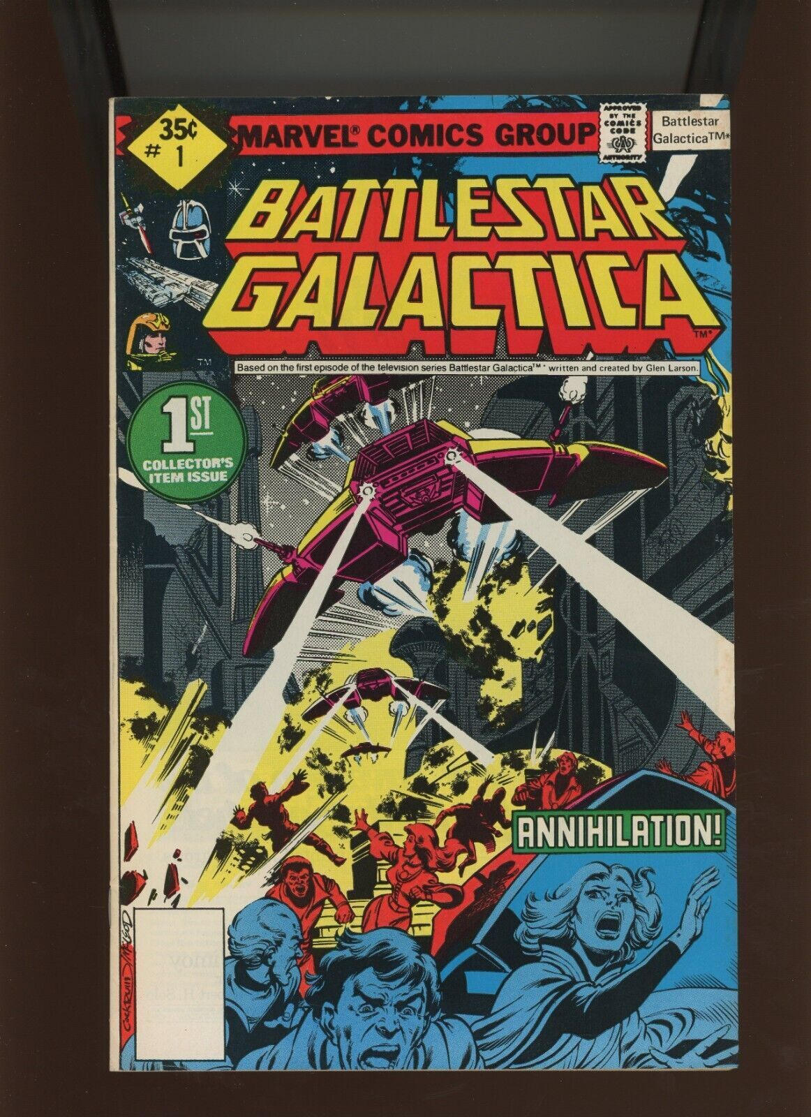 (1979) Battlestar Galactica #1: BRONZE AGE! KEY! WHITMAN VARIANT! (7.0/7.5)Size: 7" x 10"This item was uploaded by KB.***WE COMBINE SHIPPING!!!****Either wait for us to send you an invoice after you commit to buy or, if it makes you pay right away, message us back and we'll refund the excess charge. *Buy as many single comic books as you want for one low flat shipping rate in the United States! International orders will be charged exactly according to the size and weight. *If you have any specific questions or requests, please ask us prior to ordering and we'll get back to you as soon as we can. *If there are any problems with your order whatsoever, please message us before leaving feedback and we'll be happy to work with you to fix the situation! *We ship worldwide, combine purchases, and charge exact shipping. The price may vary based on size, weight, and location. If you are automatically overcharged for shipping, message us and we'll be happy to revise the invoice or refund you the excess amount. If you have any questions regarding shipping, please message us. International Buyers - Please Note: *Import duties, taxes, and charges are not included in the item price or shipping cost. These charges are the buyer's responsibility. *Please check with your country's customs office to determine what these additional costs will be prior to bidding or buying. *Payment can be made via PayPal and credit cards (directly). 120,000+ items in total in my Hip store! Frequently Asked Questions: What are your hours of operation?Our in-office hours are Monday - Friday, 11 am - 8 pm. We are not open on weekends, so if you send us a request on Friday evening we won't get back to you until Monday afternoon. Please don't take it as us ignoring you! We will work on your request Monday and get back to you as soon as we can. Also, if you order from us on a Friday evening or Saturday morning we won't start processing your order until we open on Monday. That means on Monday it will be pulled and prepped for shipping, then picked up by the postman on Tuesday morning.When will you ship my item? The tracking hasn't moved.We realize you're eager to get your item, so if the tracking hasn't moved in a few days please don't be concerned. We give the postman a lot of packages daily, sometimes as many as 100, so he does not scan each item for us upon pickup as he says it would be too time consuming for him to do so. If you get a tracking number from us, that almost always means your item was picked up by the postman the next business day. The USPS is also imperfect. There are times when the tracking won't even show movement until it's in your area's regional distribution center. This is normal in our experience. Is the item pictured the exact one for sale?Yes! We don't use stock images and go through great lengths to scan or photograph everything we list. The item pictured is exactly what you should receive UNLESS it is a fixed price listing with multiple items available. Can you issue a COA? We can, upon request. Please make sure you leave us a note while checking out and shoot us a message immediately after requesting one, just to be sure. How do you grade?Grading is very subjective, but we are professionals with decades of grading experience between us who try the best we can to accurately describe the condition of the items we list. Anthony is an Overstreet Comic Book Price Guide Advisor Please see the grading chart below for a breakdown of how we grade: NOTE: We don't grade any raw books higher than 9.2, as once you go higher than that grading gets really subjective. If you buy a NM book from us, it may very well be higher than 9.2 but we play it safe and grade conservatively. 9.2 NM Near Mint 9.0 VF/NM Very Fine/Near Mint 8.5 VF+ Very Fine+ 8.0 VF Very Fine 7.5 VF- Very Fine- 7.0 FN/VF Fine/Very Fine 6.5 FN+ Fine+ 6.0 FN Fine 5.5 FN- Fine- 5.0 VG/FN Very Good/Fine 4.5 VG+ Very Good+ 4.0 VG Very Good 3.5 VG- Very Good- 3.0 GD/VG Good/Very Good 2.5 GD+ Good+ 2.0 GD Good 1.8 GD- Good- 1.5 FR/GD Fair/Good 1.0 FR Fair 0.5 PR PoorHow do you ship comics? We ship in rigid cardboard mailers to protect your comic book from the worst the mail system has to offer. Price varies based on the number of books you purchase, but we try to keep costs as low as we can and charge exact shipping. If it looks unusually high to you please send us a message and we'll be happy to double check for you. Do you combine shipping? Yes, of like items. Such as: several comics can fit in one cardboard mailer, as can more than one record. Multiple art pages can easily be combined because they are light and thin. Where combined shipping differs is with size and weight. For instance, two statues require a much bigger box. Same goes for CGCs, as the package gets bigger and heavier as you go. Do you ship well? I've had some bad experiences... You needn't worry; we are professionals who value your business and want your item to arrive safely as much as you do. I have been collecting for over 30 years. I send out items the way I would like to receive them. The tracking says my item is "OUT FOR DELIVERY" in New Jersey. Why is that?If the tracking indicates that the item is "OUT FOR DELIVERY" in NJ don't worry, it's just what the tracking says when it's carried over from the postman to the sorting center. This is normal for our Post Office and will not impact you receiving your item in a timely matter.What is the difference between a RUN and a LOT?Good question. A RUN will be a collection of consecutive issues with no breaks in between them. If it says RUN of #s 1 - 50 you will receive 50 consecutive comics. A LOT will be within a certain range, so a 50pc LOT will not contain consecutive books.I changed my mind after successfully winning the auction or fixed price listing, will you cancel the transaction? Please only bid or hit BUY IT NOW if you are willing to follow through and pay for the item, we will not cancel the transaction. As a seller, Hip penaliz