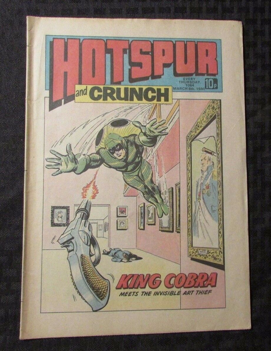1980 HOTSPUR UK Weekly Newspaper Comic #1064 VG+ King CobraCondition/Grade: VG+ , tanning to edges , SEE PICS!!!This Auction posted by DAVE, for faster service please address any questions to DAVE. Thank You, Happy Bidding!Frequently Asked Questions: What is your base shipping for raw comics?Our base ship method will be in a media box, media mail for $5 domestic. If it says expedited $5.60 that’s a typo! Base shipping price you see is for your item to be shipped very well in the appropriate box. We spend money on these boxes to protect during shipping so you can be confident your item will arrive securely. What is your base shipping for CGC comics?Domestic for CGCs are $10 for the first and $5 for each additional one you add.Do you combine shipping? Yes, of like items. Such as: several comics can fit in one media box, as can more than one record. Multiple art pages can easily be combined because they are light and thin. Where combined shipping differs is with size and weight. For instance, two statues require a much bigger box. Same goes for CGCs, as the package gets bigger and heavier as you go.Do you ship well? I’ve had some bad experiences… You needn’t worry; we are professionals who value your business and want your item to arrive safely as much as you do. I have been collecting for over 30 years. I send out items the way I would like to receive them. What does WH mean? We operate out of two locations, so WH stands for Warehouse, an internal code for us to know which location the item is in.Have these CGCs had any previous owners? No. I have personally sent in almost all of these to CGC and had them returned to me, offering them fresh to the market for the 1st time. I see the word STAT when describing the art page I’m interested in. What’s a STAT? A STAT is essentially a photocopy glued on to one or more of the panels by the artist done during production of the piece and is not original artwork. We will do our best to clearly identify what’s a STAT or what isn't on your page, if indeed it contains one.I changed my mind after successfully winning the auction or fixed price listing, will you cancel the transaction? Please only bid or hit BUY IT NOW if you are willing to follow through and pay for the item, we will not cancel the transaction. As a seller, Hip penalizes us every time we cancel an order, so it is detrimental to our business to do so. Therefore if you will not pay, then you'll have to let Hip cycle this to an “unpaid item” and accept whatever action Hip deems necessary. How do you grade? 10.0 GM Gem Mint 9.9 M Mint 9.8 NM/M Near Mint/Mint 9.6 NM+ Near Mint+ 9.4 NM Near Mint 9.2 NM- Near Mint- 9.0 VF/NM Very Fine/Near Mint 8.5 VF+ Very Fine+ 8.0 VF Very Fine 7.5 VF- Very Fine- 7.0 FN/VF Fine/Very Fine 6.5 FN+ Fine+ 6.0 FN Fine 5.5 FN- Fine- 5.0 VG/FN Very Good/Fine 4.5 VG+ Very Good+ 4.0 VG Very Good 3.5 VG- Very Good- 3.0 GD/VG Good/Very Good 2.5 GD+ Good+ 2.0 GD Good 1.8 GD- Good- 1.5 FR/GD Fair/Good 1.0 FR Fair 0.5 PR Poor Grading is VERY subjective, i try to grade items as best i can but use the pics as a guide for yourself and if you still have any questions send an email. Happy Bidding!We use the comic book grading system (link below) for almost all of our auctions, please refer to this chart and look at the pictures to decide for yourself if the grading is to your liking and agreement (if you notice any glaring omissions please contact us, our goal is 100% customer satisfaction). will be graded accordingly to the best of our abilities so unless the item is SEALED please refer to the guide & pictures and decide for yourself. Placing a bid on this item verifies that you agree with the grading we have provided. Happy Bidding!See ABOUT ME for 1000's of original art pages in stockI combine shipping on multiple buys! I combine shipping on multiple buys! See FAQAS SEEN ON TV: I have been buying and selling artwork and comics for about 20 years. The artwork pictured are all one of kind originals unless otherwise described. If you are new to buying art feel free to ask any questions that you may have.Anthony is always interested in doing business and answering your questions feel free to call or e-mail me to let me know what you have. This # is text enabled as well.See ABOUT ME for 1000's of original art pages in stock Small, Regular, and Large Portfolios available; see my Hip store! Froo | Froo Cross Sell, Free Cross Sell, Cross promote, Hip Marketing, Hip listing Apps, Hip Apps, Hip Application