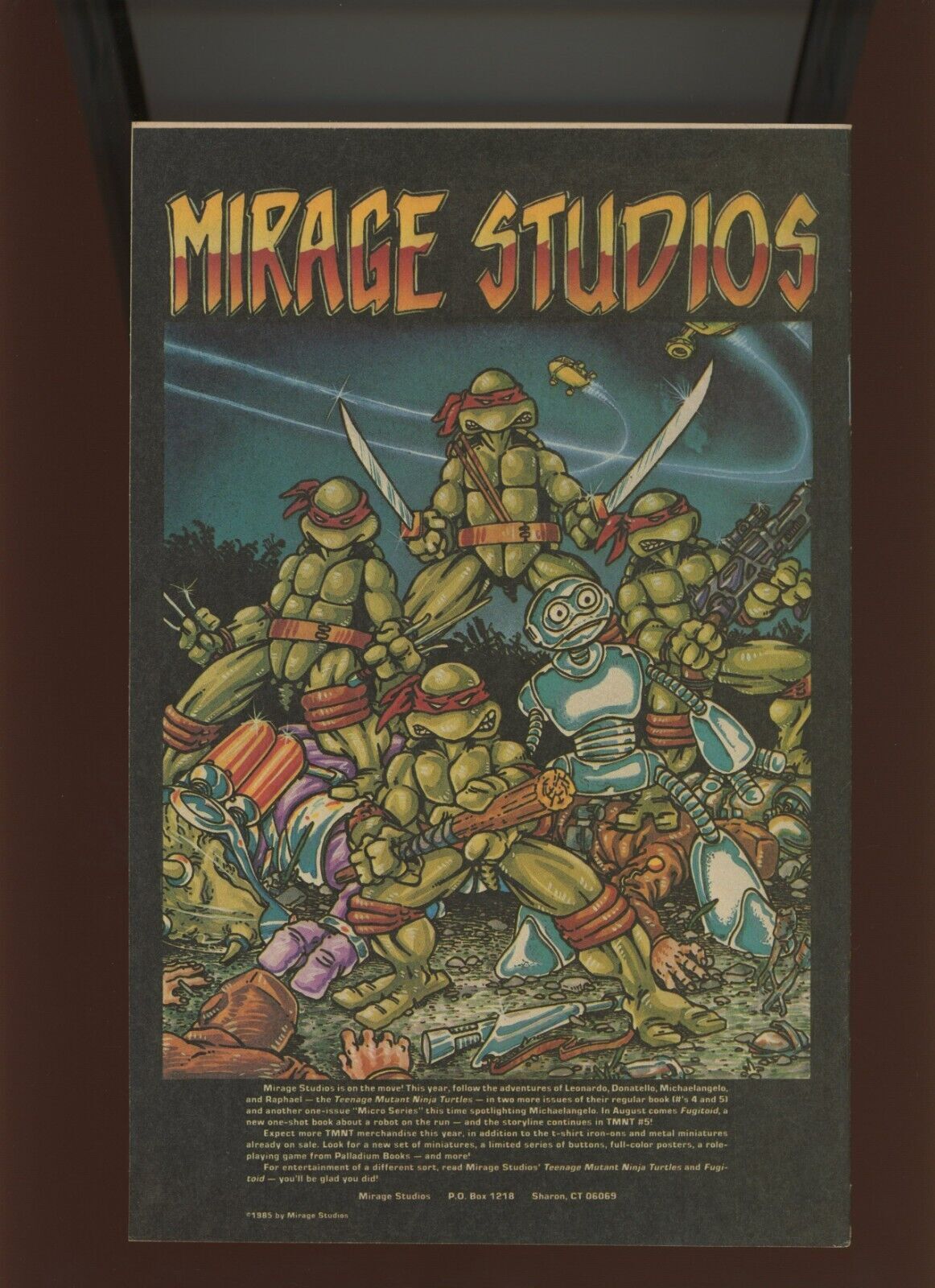 (1985) New Age Comics #1: KEY! 1ST FULL COLOR IMAGE OF THE "TMNT"! (9.0/9.2)Size: 7" x 10"This item was uploaded by KB.***WE COMBINE SHIPPING!!!****Either wait for us to send you an invoice after you commit to buy or, if it makes you pay right away, message us back and we'll refund the excess charge. *Buy as many single comic books as you want for one low flat shipping rate in the United States! International orders will be charged exactly according to the size and weight. *If you have any specific questions or requests, please ask us prior to ordering and we'll get back to you as soon as we can. *If there are any problems with your order whatsoever, please message us before leaving feedback and we'll be happy to work with you to fix the situation! *We ship worldwide, combine purchases, and charge exact shipping. The price may vary based on size, weight, and location. If you are automatically overcharged for shipping, message us and we'll be happy to revise the invoice or refund you the excess amount. If you have any questions regarding shipping, please message us. International Buyers - Please Note: *Import duties, taxes, and charges are not included in the item price or shipping cost. These charges are the buyer's responsibility. *Please check with your country's customs office to determine what these additional costs will be prior to bidding or buying. *Payment can be made via PayPal and credit cards (directly). 120,000+ items in total in my Hip store! Frequently Asked Questions: What are your hours of operation?Our in-office hours are Monday - Friday, 11 am - 8 pm. We are not open on weekends, so if you send us a request on Friday evening we won't get back to you until Monday afternoon. Please don't take it as us ignoring you! We will work on your request Monday and get back to you as soon as we can. Also, if you order from us on a Friday evening or Saturday morning we won't start processing your order until we open on Monday. That means on Monday it will be pulled and prepped for shipping, then picked up by the postman on Tuesday morning.When will you ship my item? The tracking hasn't moved.We realize you're eager to get your item, so if the tracking hasn't moved in a few days please don't be concerned. We give the postman a lot of packages daily, sometimes as many as 100, so he does not scan each item for us upon pickup as he says it would be too time consuming for him to do so. If you get a tracking number from us, that almost always means your item was picked up by the postman the next business day. The USPS is also imperfect. There are times when the tracking won't even show movement until it's in your area's regional distribution center. This is normal in our experience. Is the item pictured the exact one for sale?Yes! We don't use stock images and go through great lengths to scan or photograph everything we list. The item pictured is exactly what you should receive UNLESS it is a fixed price listing with multiple items available. Can you issue a COA? We can, upon request. Please make sure you leave us a note while checking out and shoot us a message immediately after requesting one, just to be sure. How do you grade?Grading is very subjective, but we are professionals with decades of grading experience between us who try the best we can to accurately describe the condition of the items we list. Anthony is an Overstreet Comic Book Price Guide Advisor Please see the grading chart below for a breakdown of how we grade: NOTE: We don't grade any raw books higher than 9.2, as once you go higher than that grading gets really subjective. If you buy a NM book from us, it may very well be higher than 9.2 but we play it safe and grade conservatively. 9.2 NM Near Mint 9.0 VF/NM Very Fine/Near Mint 8.5 VF+ Very Fine+ 8.0 VF Very Fine 7.5 VF- Very Fine- 7.0 FN/VF Fine/Very Fine 6.5 FN+ Fine+ 6.0 FN Fine 5.5 FN- Fine- 5.0 VG/FN Very Good/Fine 4.5 VG+ Very Good+ 4.0 VG Very Good 3.5 VG- Very Good- 3.0 GD/VG Good/Very Good 2.5 GD+ Good+ 2.0 GD Good 1.8 GD- Good- 1.5 FR/GD Fair/Good 1.0 FR Fair 0.5 PR PoorHow do you ship comics? We ship in rigid cardboard mailers to protect your comic book from the worst the mail system has to offer. Price varies based on the number of books you purchase, but we try to keep costs as low as we can and charge exact shipping. If it looks unusually high to you please send us a message and we'll be happy to double check for you. Do you combine shipping? Yes, of like items. Such as: several comics can fit in one cardboard mailer, as can more than one record. Multiple art pages can easily be combined because they are light and thin. Where combined shipping differs is with size and weight. For instance, two statues require a much bigger box. Same goes for CGCs, as the package gets bigger and heavier as you go. Do you ship well? I've had some bad experiences... You needn't worry; we are professionals who value your business and want your item to arrive safely as much as you do. I have been collecting for over 30 years. I send out items the way I would like to receive them. The tracking says my item is "OUT FOR DELIVERY" in New Jersey. Why is that?If the tracking indicates that the item is "OUT FOR DELIVERY" in NJ don't worry, it's just what the tracking says when it's carried over from the postman to the sorting center. This is normal for our Post Office and will not impact you receiving your item in a timely matter.What is the difference between a RUN and a LOT?Good question. A RUN will be a collection of consecutive issues with no breaks in between them. If it says RUN of #s 1 - 50 you will receive 50 consecutive comics. A LOT will be within a certain range, so a 50pc LOT will not contain consecutive books.I changed my mind after successfully winning the auction or fixed price listing, will you cancel the transaction? Please only bid or hit BUY IT NOW if you are willing to follow through and pay for the item, we will not cancel the transaction. As a seller, Hip penali