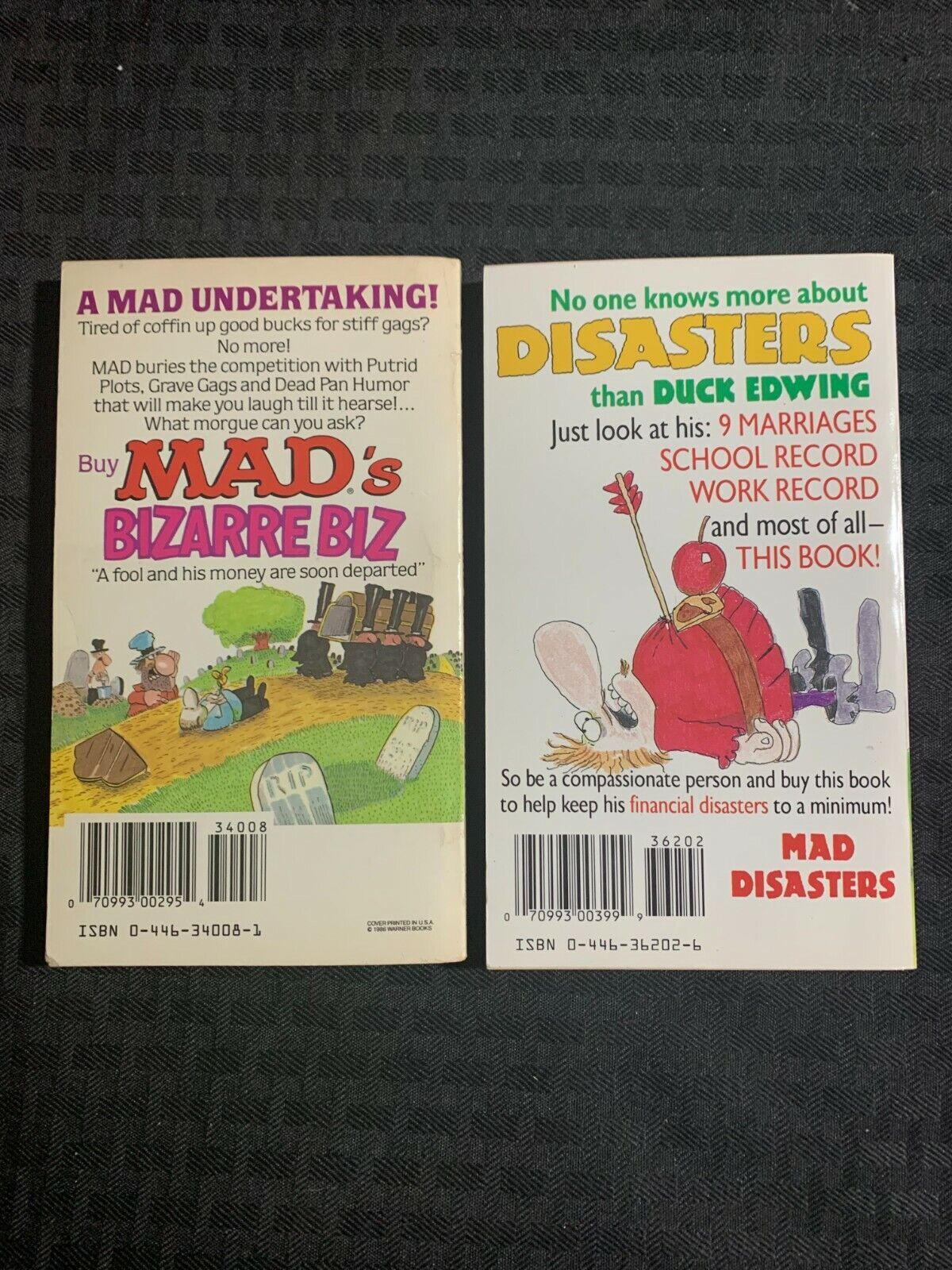 Condition: Condition/Grade: FN/FN+ , SEE PICS!!!1987/92 MAD Bizarre & Disasters 1st Ed FN/FN+ Paperback - Nick Meglin CollectionCondition/Grade: FN FN+ , SEE PICS!!!THE NICK MEGLIN FILE COPIES COLLECTION: Nick was the last sitting editor at Mad Magazine. These items come from his personal collection and we are happy to share these (mostly high grade) items with the collecting public. !!! A post card, business card or letterhead stationary sheet will be randomly inserted into some of these NMC listings. Limited quantities available. (one bonus per auction listing.) Happy Bidding !!!This item was listed by DG.If you have any specific questions or requests, please ask us prior to ordering and we'll get back to you as soon as we can. If there are any problems with your order whatsoever, please message us before leaving feedback and we'll be happy to work with you to fix the situation! We ship worldwide, combine purchases, and charge exact shipping. The price may vary based on size, weight, and location. If you are automatically overcharged for shipping, message us and we'll be happy to revise the invoice or refund you the excess amount. If you have any questions regarding shipping, please message us.International Buyers - Please Note: Import duties, taxes, and charges are not included in the item price or shipping cost. These charges are the buyer's responsibility.Please check with your country's customs office to determine what these additional costs will be prior to bidding or buying.YES, WE COMBINE SHIPPING. YES, WE COMBINE SHIPPING. YES, WE COMBINE SHIPPING. I have been buying and selling artwork and comics for about 20 years. If you are new to buying art or comics feel free to ask any questions that you may have.200,000+ items in total in my Hip store!Small, Regular, and Large Portfolios available; see my Hip store!