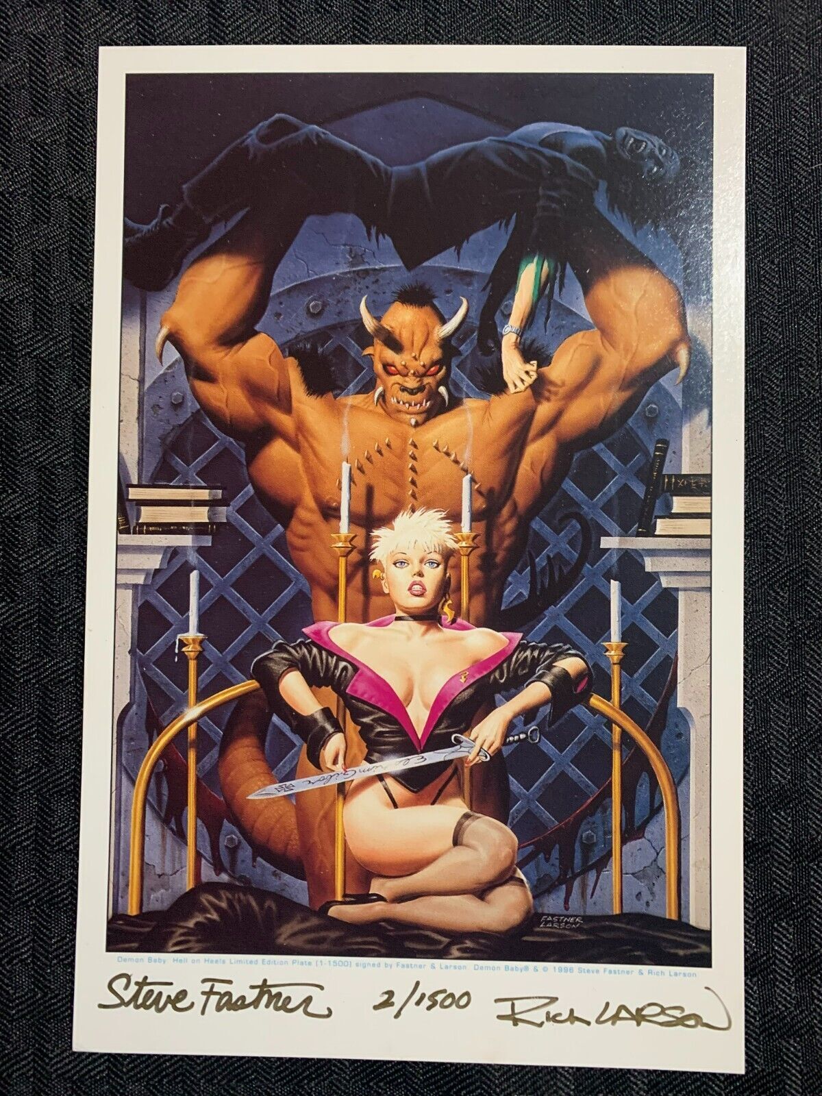 Condition: Condition/Grade: VF+ 8.5 , SEE PICS!!!1996 DEMON BABY Hell on Hells SC VF+ 8.5 SIGNED 2x w/ Tip-In Plate #2/1500 Fastner & LarsenThis item was listed by DG.If you have any specific questions or requests, please ask us prior to ordering and we'll get back to you as soon as we can. If there are any problems with your order whatsoever, please message us before leaving feedback and we'll be happy to work with you to fix the situation! We ship worldwide, combine purchases, and charge exact shipping. The price may vary based on size, weight, and location. If you are automatically overcharged for shipping, message us and we'll be happy to revise the invoice or refund you the excess amount. If you have any questions regarding shipping, please message us.International Buyers - Please Note: Import duties, taxes, and charges are not included in the item price or shipping cost. These charges are the buyer's responsibility.Please check with your country's customs office to determine what these additional costs will be prior to bidding or buying.YES, WE COMBINE SHIPPING. YES, WE COMBINE SHIPPING. YES, WE COMBINE SHIPPING. I have been buying and selling artwork and comics for about 20 years.If you are new to buying art or comics feel free to ask any questions that you may have.300,000+ items in total in my Hip store!Small, Regular, and Large Portfolios available; see my Hip store!