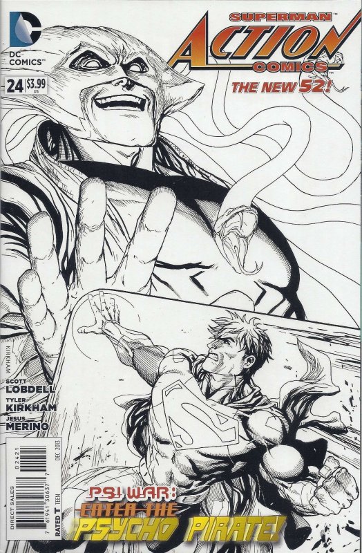 Item: Action Comics (2nd Series) #24A | Publisher: DC | Cover Date: December 2013 | Writer: Scott Lobdell | Artist: Tyler Kirkham | Cover Artist: Tyler Kirkham | Appearances: Lois Lane, Superman (Clark Kent/Kal-El), Psycho-Pirate (Roger Hayden), Hector Hammond, Lana Lang, Kenny Braverman, Jonathan Kent, Martha Kent, Jor-El, Lara Lor-Van | Storylines: Psi War, Part 2 | Notes: Variant Cover; Versus Psycho-Pirate | With Economy shipping, each additional comic ships for just 50 cents more to customers in the USA. This listing contains a stock photo and information from ComicBase™ and © Human Computing. The stock photo is for reference only. If you would like to see a photo of the actual item, please message us prior to purchasing.Seller Information