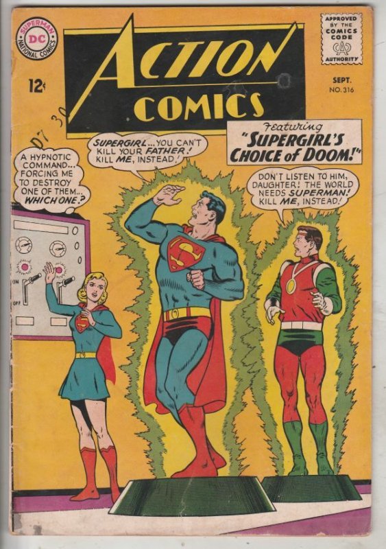 Action Comics #316 - Supergirl's Choice of Doom! APPEARANCE - Supergirl APPEARANCE - Supergirl's Father! This book has nice eye-appeal and deep rich color on this all-time-classic Superman and Supergirl's Father i ... Read More