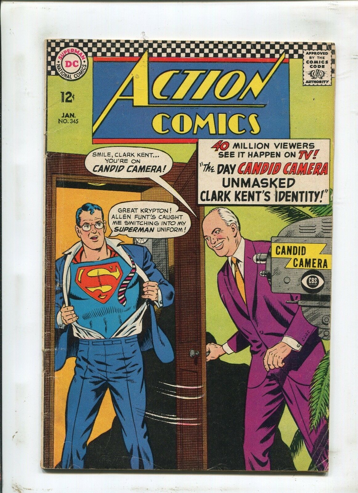 Grade: 4.5 VG+ACTION COMICS #345 - EXILE OF STEEL! - (4.5) 1967Size: 7" x 10"This item was uploaded by HR.If you have any specific questions or requests, please ask us prior to ordering and we'll get back to you as soon as we can. If there are any problems with your order whatsoever, please message us before leaving feedback and we'll be happy to work with you to fix the situation! We ship worldwide, combine purchases, and charge exact shipping. The price may vary based on size, weight, and location. If you are automatically overcharged for shipping, message us and we'll be happy to revise the invoice or refund you the excess amount. If you have any questions regarding shipping, please message us. International Buyers - Please Note: Import duties, taxes, and charges are not included in the item price or shipping cost. These charges are the buyer's responsibility. Please check with your country's customs office to determine what these additional costs will be prior to bidding or buying. Payment can be made by PayPal and credit cards directly. 87,000+ items in total in my Hip store! Frequently Asked Questions: When are your operation hours?Our in office hours are Monday - Friday, 11 am - 9 pm. We are not open on weekends, so if you send us a request on Friday evening we won't get back to you until Monday afternoon. Please don't take it as us ignoring you! We will work on your request Monday and get back to you as soon as we can. Also, if you order from us on a Friday evening or Saturday morning we won't start processing your order until we open on Monday. That means on Monday it will be pulled and prepped for shipping, then picked up by the postman on Tuesday morning.When will you ship my item? The tracking hasn't moved.We realize you're eager to get your item, so if the tracking hasn't moved in a few days please don't be concerned. We give the postman a lot of packages daily, sometimes as many as 100, so he does not scan each item for us upon pickup as he says it would be too time consuming for him to do so. If you get a tracking number from us, that almost always means your item was picked up by the postman the next business day. The USPS is also imperfect. There are times when the tracking won't even show movement until it's in your area's regional distribution center. This is normal in our experience. Is the item pictured the exact one for sale?Yes! We don't use stock images and go through great lengths to scan or photograph everything we list. The item pictured is exactly what you should receive UNLESS it is a fixed price listing with multiple items available. Can you issue a COA? We can, upon request. Please make sure you leave us a note while checking out and shoot us a message immediately after requesting one, just to be sure. How do you grade?Grading is very subjective, but we are professionals with decades of grading experience between us who try the best we can to accurately describe the condition of the items we list. Anthony is an Overstreet Comic Book Price Guide Advisor Please see the grading chart below for a breakdown of how we grade: NOTE: We don't grade any raw books higher than 9.2, as once you go higher than that grading gets really subjective. If you buy a NM book from us, it may very well be higher than 9.2 but we play it safe and grade conservatively. 9.2 NM Near Mint 9.0 VF/NM Very Fine/Near Mint 8.5 VF+ Very Fine+ 8.0 VF Very Fine 7.5 VF- Very Fine- 7.0 FN/VF Fine/Very Fine 6.5 FN+ Fine+ 6.0 FN Fine 5.5 FN- Fine- 5.0 VG/FN Very Good/Fine 4.5 VG+ Very Good+ 4.0 VG Very Good 3.5 VG- Very Good- 3.0 GD/VG Good/Very Good 2.5 GD+ Good+ 2.0 GD Good 1.8 GD- Good- 1.5 FR/GD Fair/Good 1.0 FR Fair 0.5 PR PoorHow do you ship comics? We ship in rigid cardboard mailers to protect your comic book from the worst the mail system has to offer. Price varies based on the number of books you purchase, but we try to keep costs as low as we can and charge exact shipping. If it looks unusually high to you please send us a message and we'll be happy to double check for you. Do you combine shipping? Yes, of like items. Such as: several comics can fit in one cardboard mailer, as can more than one record. Multiple art pages can easily be combined because they are light and thin. Where combined shipping differs is with size and weight. For instance, two statues require a much bigger box. Same goes for CGCs, as the package gets bigger and heavier as you go. Do you ship well? I've had some bad experiences... You needn't worry; we are professionals who value your business and want your item to arrive safely as much as you do. I have been collecting for over 30 years. I send out items the way I would like to receive them. The tracking says my item is "OUT FOR DELIVERY" in New Jersey. Why is that?If the tracking indicates that the item is "OUT FOR DELIVERY" in NJ don't worry, it's just what the tracking says when it's carried over from the postman to the sorting center. This is normal for our Post Office and will not impact you receiving your item in a timely matter.What is the difference between a RUN and a LOT?Good question. A RUN will be a collection of consecutive issues with no breaks in between them. If it says RUN of #s 1 - 50 you will receive 50 consecutive comics. A LOT will be within a certain range, so a 50pc LOT will not contain consecutive books.I changed my mind after successfully winning the auction or fixed price listing, will you cancel the transaction? Please only bid or hit BUY IT NOW if you are willing to follow through and pay for the item, we will not cancel the transaction. As a seller, Hip penalizes us every time we cancel an order, so it is detrimental to our business to do so. Therefore if you will not pay, then you'll have to let Hip cycle this to an "unpaid item" and accept whatever action Hip deems necessary. 87,000+ items in total in my Hip store! MEET OUR STAFF: Pictured left to right, my employees: Chris, Connelly, Bobby, & Shannon alongside my family: Sharon, Mysel