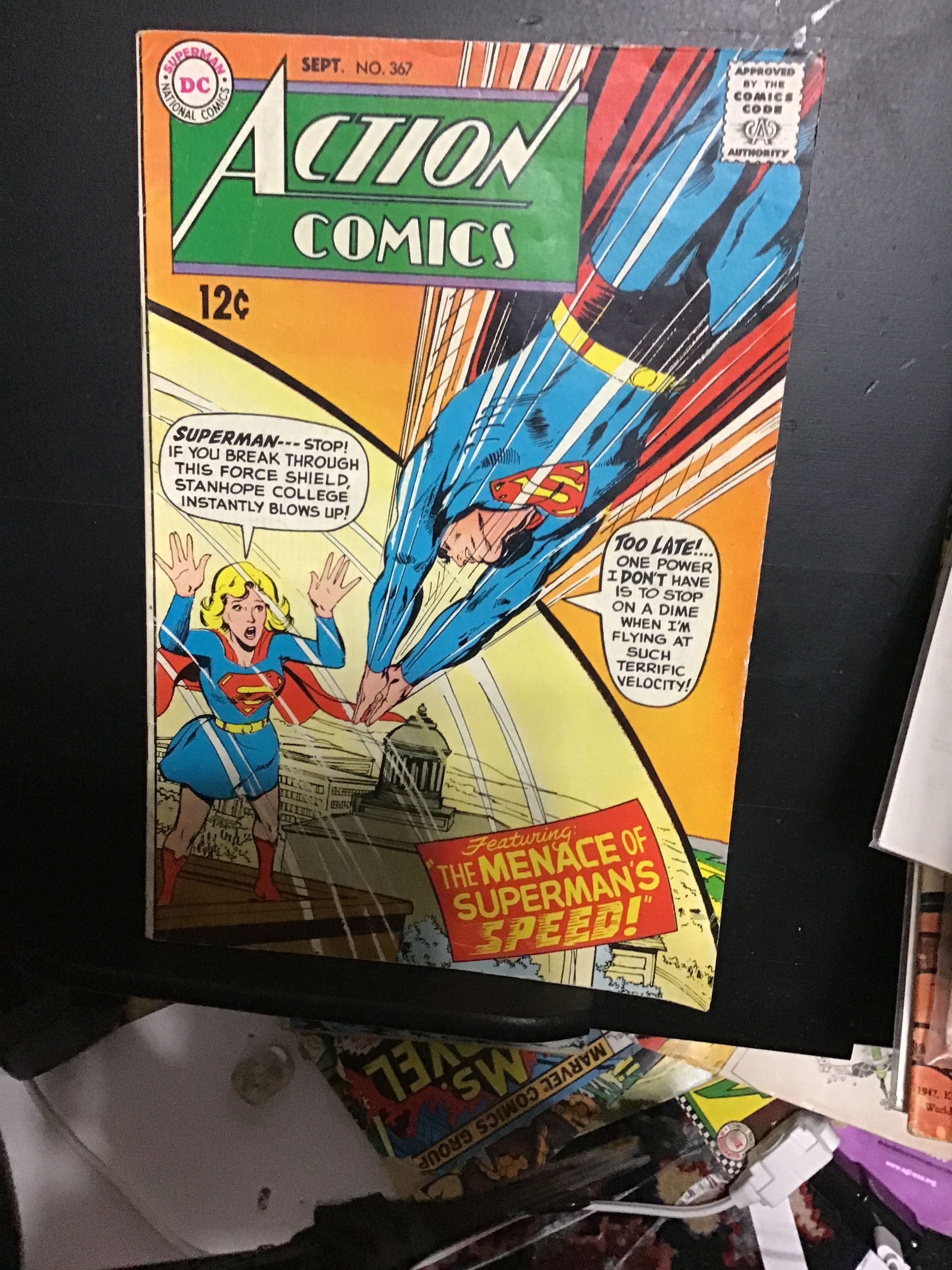 Action Comics #367 (1968) This book has deep rich color and nice eye-appeal on this all time classic Neil Adams Superman versus Supergirl cover!. With cream pages and white inside covers. The book Is well attached at the spine and the staples with a faint bend of the lower outer corner of the front cover that we nearly missed as you have to look closely to see it. We have adjust the grade accordingly. With light wear appropriate grade. This book comes with a certificate of authenticity from our one owner high-grade Boca collection!Seller Information