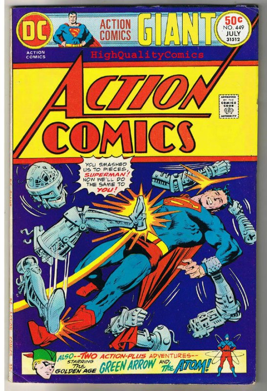 Condition: See our description area for more info...ACTION COMICS #449, FN+, Superman, Giant Size,1938, more SM in store ACTION COMICS #449...... Name of Comic(s)/Title?: ACTION COMICS #449.... Publisher: DC Comics.... Art by/Featuring/Stories?: Featuring a copy of the ACTION COMICS comic.....Writer(s) : Elliot Maggin, Gardner Fox...Artist(s) : Curtis Swan, Jack Kirby, Gil Kane, Sid Greene ....Story(s) : "Superman in My Best Friend - The Super-Spy, & Green Arrow in the Mystery of the Giant Arrows, & The Atom in the Atomic Flea"......Cover by : ?... Grade of item? : This copy is in FINE+ condition.... Created when? : Series started in 1938, this issue made in 1975.... Front Cover description : See above scan and stated condtion...Please email with any questions ... Back Cover description : See above scan and stated condtion...Please email with any questions ... Page quality description : Off white to light tannish....All coupons and pages intact....... Tape or writing?: No... How are staples?: Staples are secure.... Flat & supple : Yes.... Don't get caught napping...Will come bagged & boarded... 1st Printing!!... ... ... ...Lots more SUPERMAN, BRONZE AGE, MOVIE/TV, Jack Kirby, Gil Kane, & ACTION COMICS items in our store. Be sure to check out all of our current on-going auctions! Lots of great product at affordable prices! Bookmark our listings with (control + D). Lots more coming in the next few weeks... Check out the scan(s). If you like this? Our store name is HighQualityComics...aka HQComics... We have been doing mail-order since 1988. We guarantee Absolute Satisfaction on All Orders! Shipping in a box. Combine auctions to save on postage. INTERNATIONAL CUSTOMERS : Email us for international shipping rates & acceptable ways to pay. INTERNATIONAL CUSTOMERS : Email us for acceptable ways to pay and shipping options, before you place an order. Thanks! This listing created with GLETech Multiple Selling Channel tools.