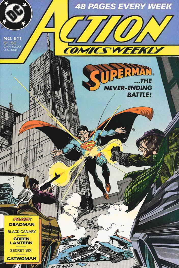 Item: Action Comics #611 | Publisher: DC | Cover Date: October 1988 | Writer: Peter David, Mike Baron, Roger Stern, Martin Pasko, Mindy Newell, Sharon Wright | Artist: Tod Smith, Dan Jurgens, Dan Spiegle, Curt Swan, Barry Kitson, Randy DuBurke | Cover Artist: Alex Niño | Appearances: Superman, Green Lantern II, Deadman, Catwoman, Black Canary, Secret Six | Storylines: Green Lantern: Room Service; Deadman: Will the Real Devil Please Stand Up?; Secret Six!: Bringing Home the Bacon; Beyond Mortal Men!; Catwoman: The Tin Roof Club; Black Canary: Bitter Fruit, Part 3 | With Economy shipping, each additional comic ships for just 50 cents more to customers in the USA. This listing contains a stock photo and information from ComicBase™ and © Human Computing. The stock photo is for reference only. If you would like to see a photo of the actual item, please message us prior to purchasing.Seller Information