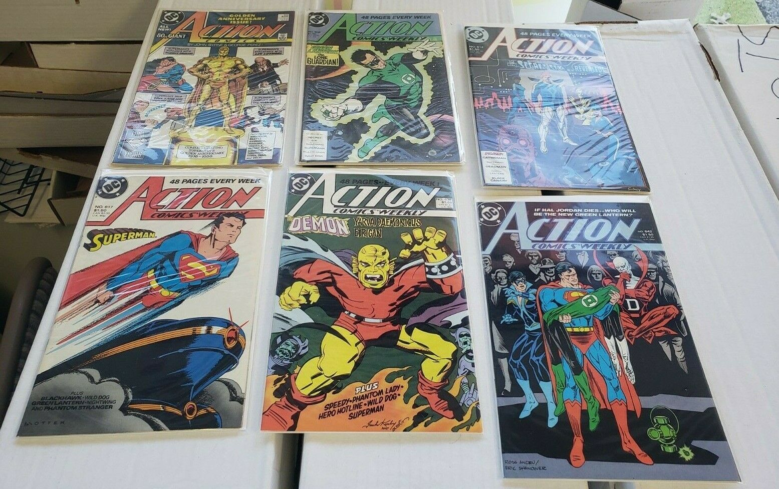 Condition: Action Comics #600Action Comics Weekly #608, #612, 617, #638, #642 Grade: 9.0 Very Fine/Near Mint Action comics 6pc (vf/nm) bagged & boarded, golden anniversary year 1988-89size: 7" x 10"this item was ... Read More