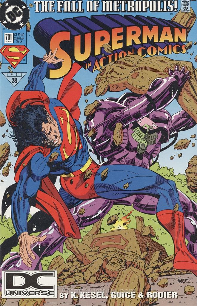 Item: Action Comics #701 (2nd) | Publisher: DC | Cover Date: July 1994 | Writer: Karl Kesel | Artist: Butch Guice | Cover Artist: Butch Guice | Appearances: Lex Luthor, Superman (Clark Kent/Kal-El), Luthor in Kryptonian battle suit | Storylines: Final Conflict | Notes: 2nd printing; [s]1994-28; Versus Luthor in Kryptonian battle suit; Fall of Metropolis; DC Universe logo in UPC box | With Economy shipping, each additional comic ships for just 50 cents more to customers in the USA. This listing contains a stock photo and information from ComicBase™ and © Human Computing. The stock photo is for reference only. If you would like to see a photo of the actual item, please message us prior to purchasing.Seller Information