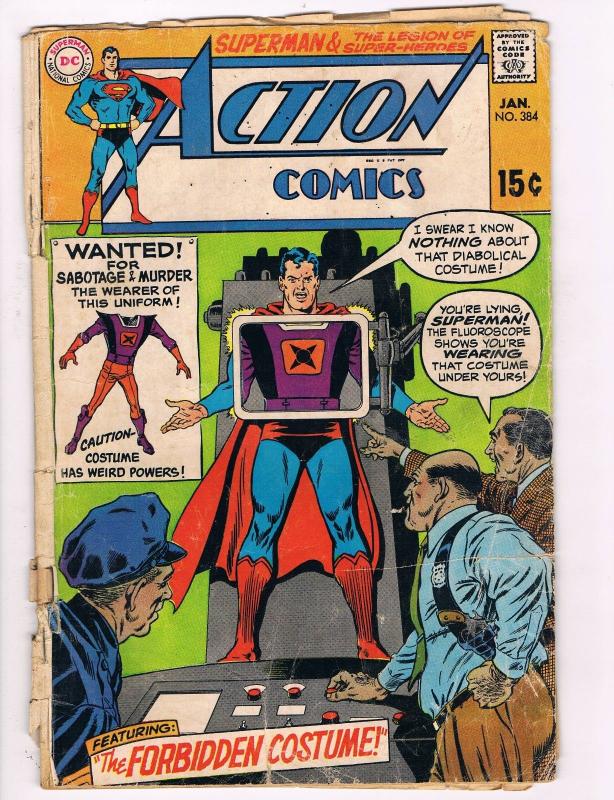 action comics # 384 !! You are bidding on 1 comic book: Action Comics Issue: # 384 Great Issue ! * Condition Information: * What's Right: Issue is complete missing no adds or pages. Center page is attac ... Read More