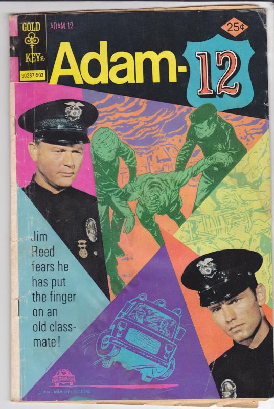 Adam-12 #5 by Gold Key Comics copyright 1975. I have graded the comic book, using the Overstreet Grading Guide, at Very GOOD with the following defects: Light stress marks along the spine. The corners are rounded. There is a fold in the upper right corner. There are wrinkles through out the cover. There is some yellowing of the pages.Seller Information