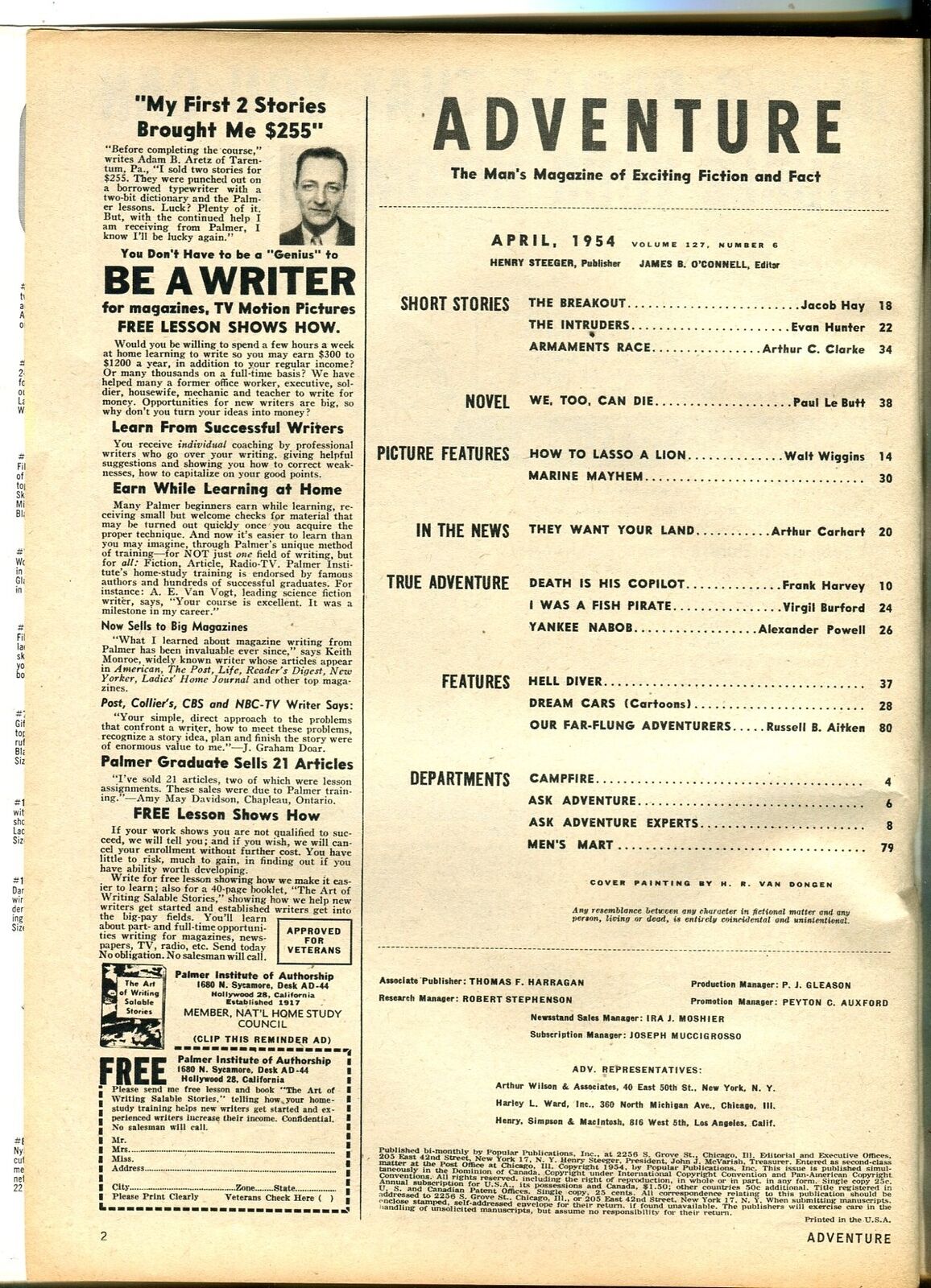 Adventure 4/1954-Popular-pulp-Arthur C Clarke-crime-sci-fi-FN