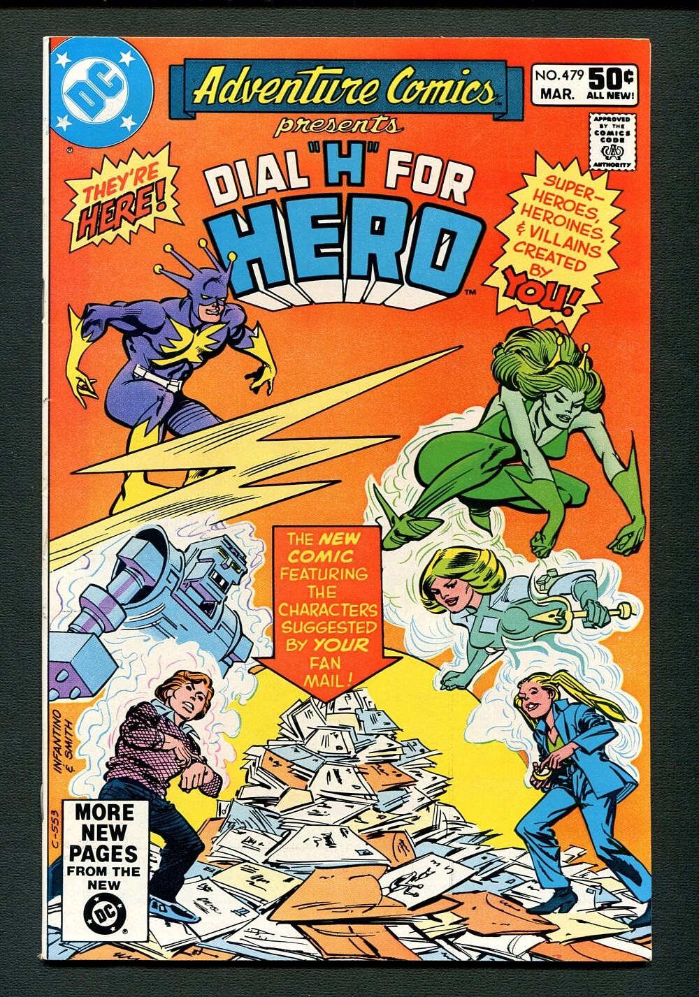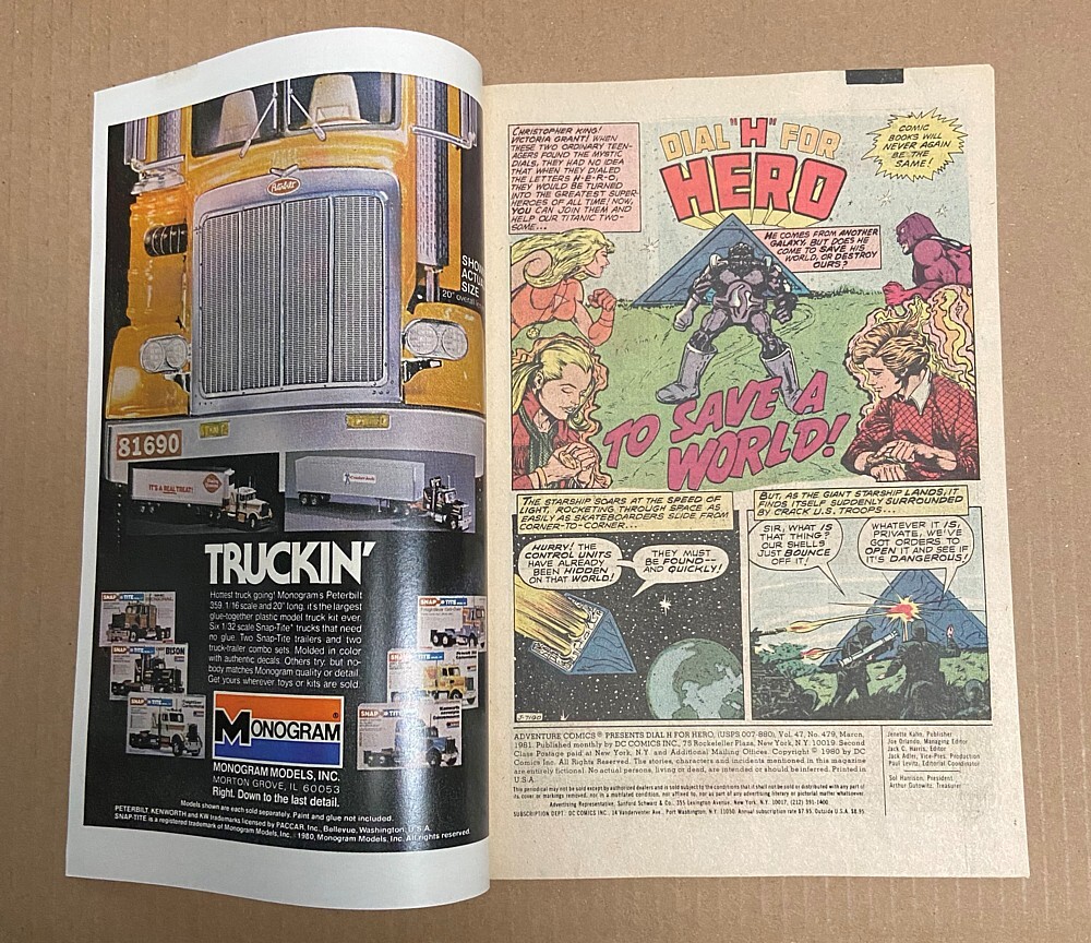 Harlan Ellison character used in Dial H for Hero story. Cover pencils by Carmine Infantino, inks by Bob Smith. To Save a World--Dial "H" For Hero, script by Marv Wolfman, pencils by Carmine Infantino, inks by Larry Mahlstedt; features characters helped into creation by reader fan mail. The Red Death--Dial "H" For Hero, script by Marv Wolfman, pencils by Carmine Infantino, inks by Dennis Jensen. As the Silver Fog Rolls In...--Dial "H" For Hero, script by Marv Wolfman, pencils by Carmine Infantino, inks by Dennis Jensen. 36 Pages