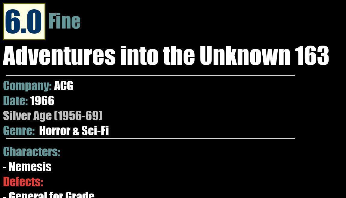 Grade: 6.0 FineShipping may take up to 5 business daysAdventures into the Unknown 163ACG - 1966Horror & Sci-FiSilver Age (1956-69)6.0 FineCharacters:- NemesisDefects:- General for Grade:
