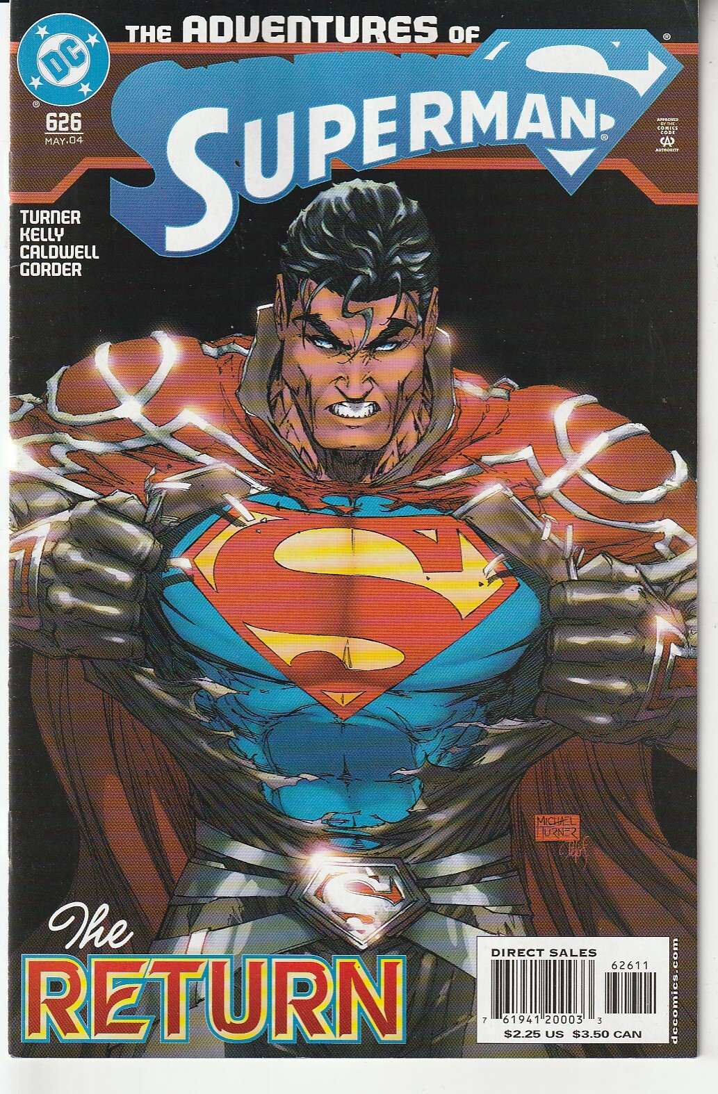 Adventures of Superman #626 Direct Edition (2004)Very Fine condition - Few cracks on front and back of spine but cover and interior pages in pristine condition. Return to Kandor Part 5 - Superman is abducted and brainwashed in retribution for neglecting the bottle city of Kandor. Story by X-Menn/Deadpool writer Joe Kelly and Witchblade/Fathom creator Michael Turner with art by Talent Caldwell